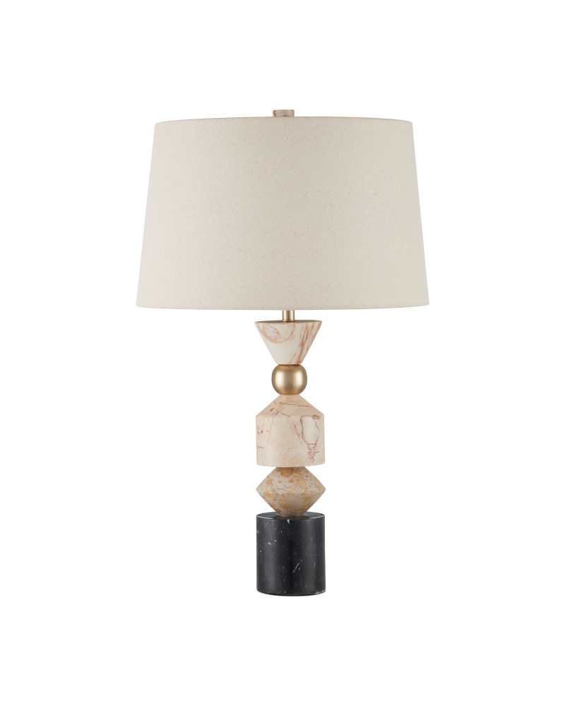 Stacked geometric shapes make up the angular Seguso Table Lamp. The mix of natural stones include black Marquina marble, Fossil beige marble, Tennessee pink marble, and golden Calcutta marble. The veined material is ornamented with one sleek orb made of metal in a gleaming golden finish. The profile of the black and beige lamp favors a modern chess piece.