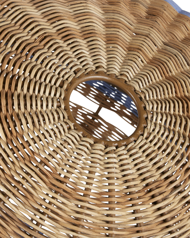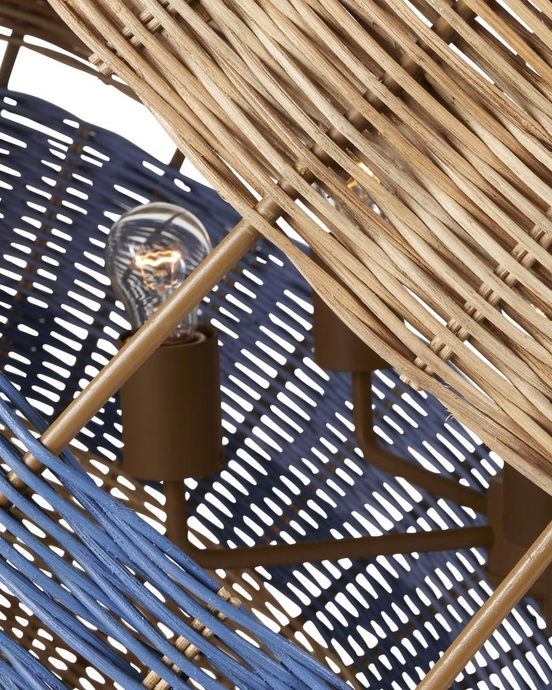 Hiroshi Koshitaka envisioned the Senjyo Tilted Orb Chandelier as one of a number of fixtures he sees as fulfilling Saisei, a concept that encompasses the acts involved in regeneration and reproduction as we restore, revive, and experience regrowth and rebirth. Rattan is woven around a wrought iron frame in stripes that graduate from a khaki finish to Bluebonnet and Cornflower blue finishes. with this tan and blue pendant, Koshitaka stays true to exploring his fascination with the Color Field tradition of the 1940s, which has been a constant in his repertoire for decades. Adjustable from 60.75" to 149.75" with use of included chain/rod kit/cable. If your space calls for a longer drop, additional chain/rods/cable is available for purchase.