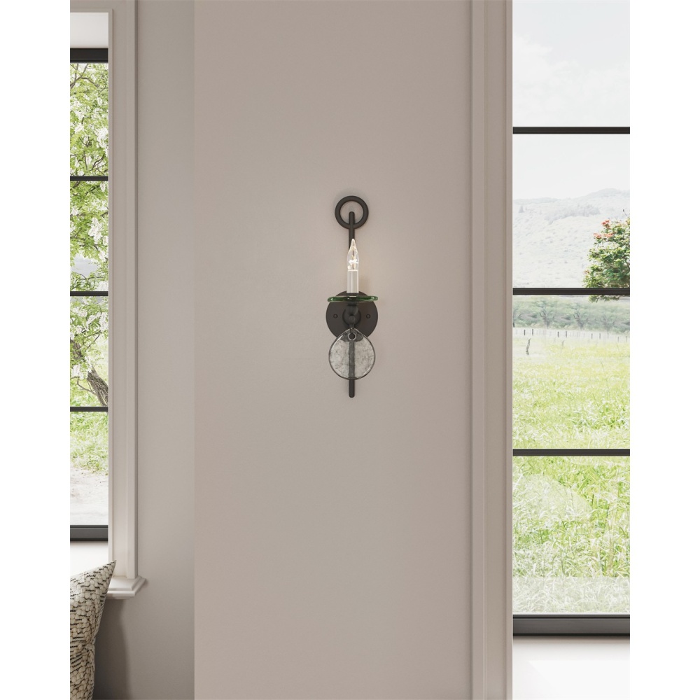 The Sethos Black Wall Sconce has a keyhole that dangles a recycled glass disc. The linear wrought iron frame in an old iron finish references early American antiques to bring the black sconce a nostalgic profile.