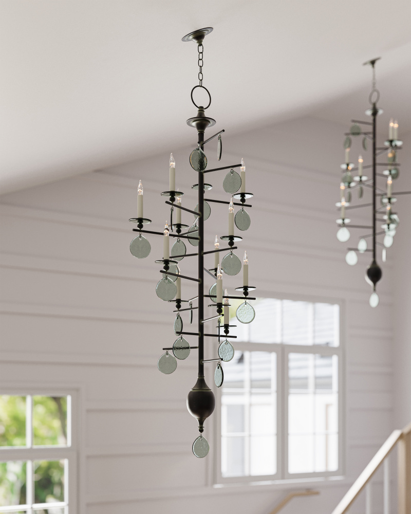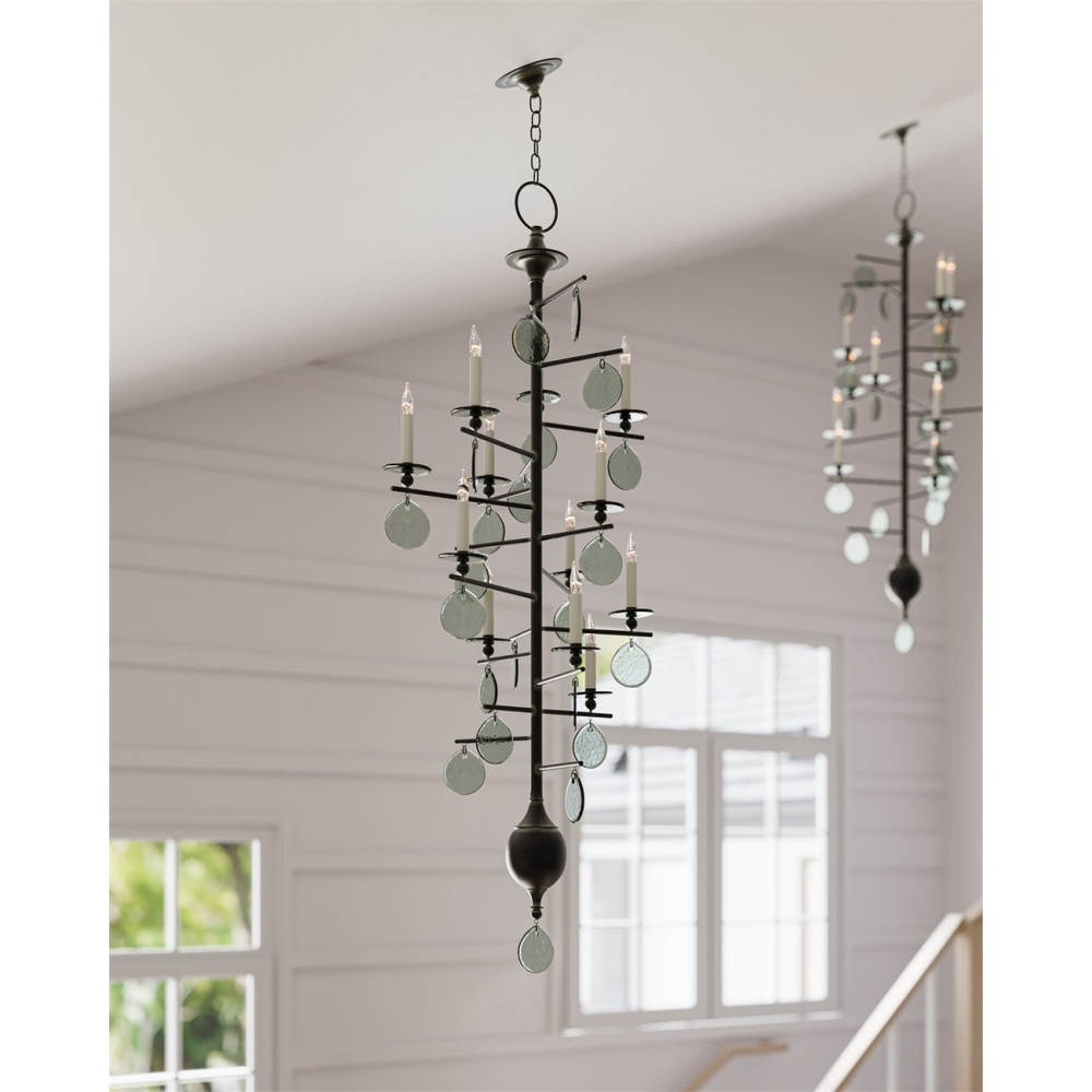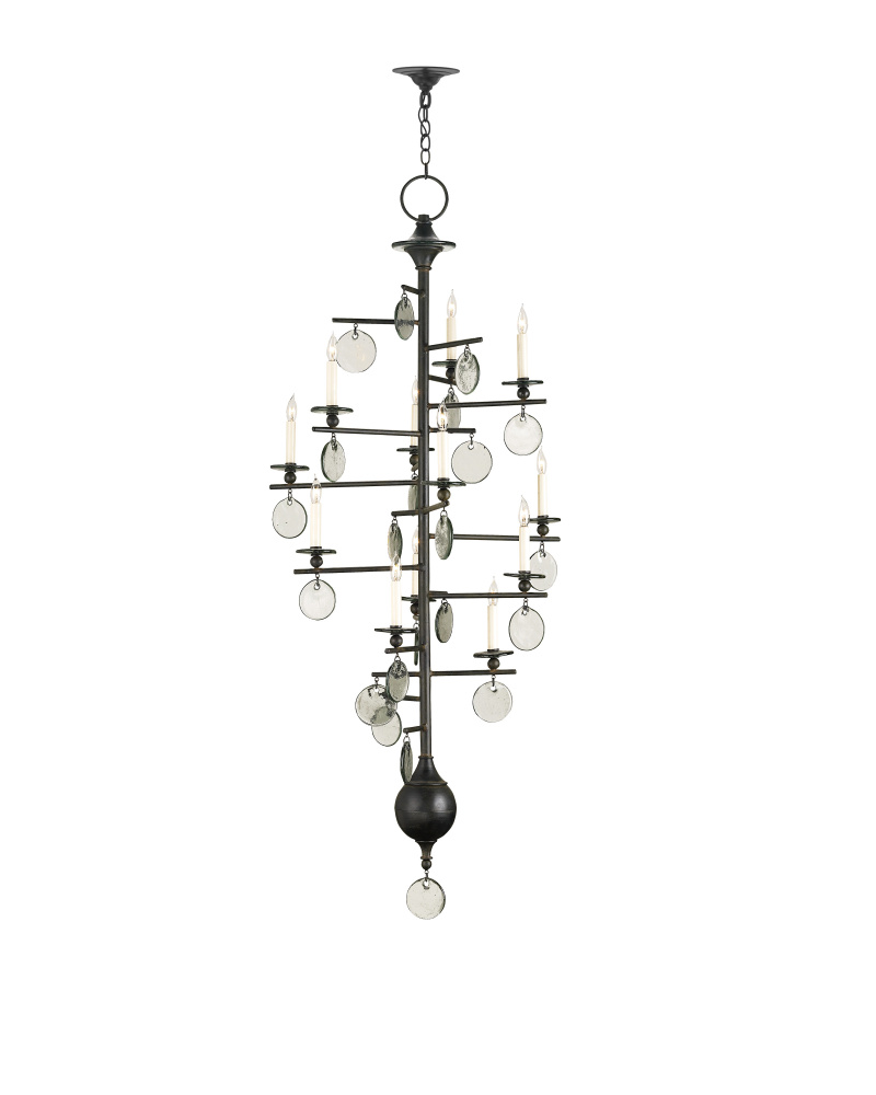 This is a very tall version of the Sethos Chandelier with its recycled glass discs and wrought iron framework that will look commanding in tall narrow spaces. The linear wrought iron frame has been treated to an old iron finish to give the design heft, while the discs of recycled glass dangling from the arms of the 12-light fixture glint when light pierces them. The unusual appearance of this chandelier will appeal to those who have grown weary of the ubiquitous candelabra.