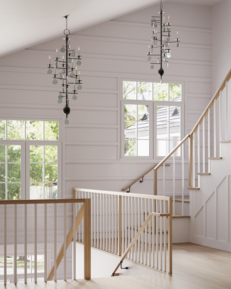 The Sethos Large Chandelier has a linear wrought iron frame in an old iron finish that refences early American antiques. This and the discs of recycled glass dangling from its arms bring the black chandelier a nostalgic feel. Adjustable from 74" to 141" with use of included chain/rod kit/cable. If your space calls for a longer drop, additional chain/rods/cable is available for purchase.