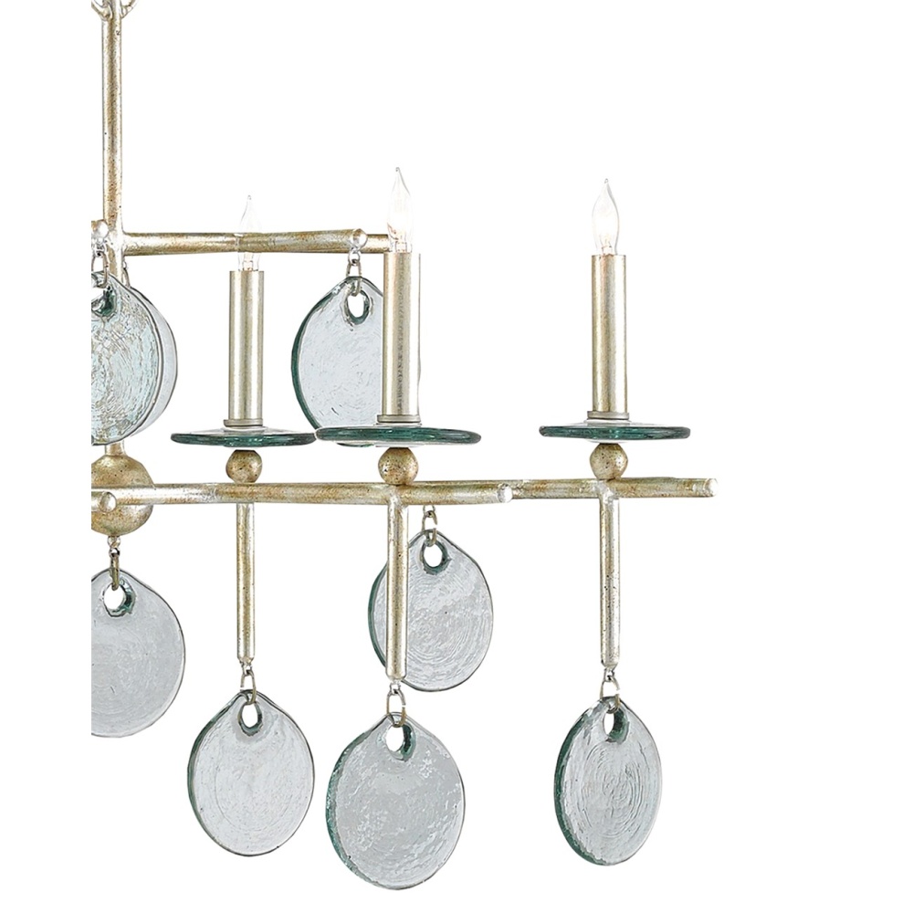 The Sethos Silver Rectangular Chandelier has a linear wrought iron frame in a silver Granello finish that refences early American antiques. This and the discs of recycled glass dangling from its arms bring the silver chandelier a nostalgic feel. Adjustable from 28" to 97" with use of included chain/rod kit/cable. If your space calls for a longer drop, additional chain/rods/cable is available for purchase.