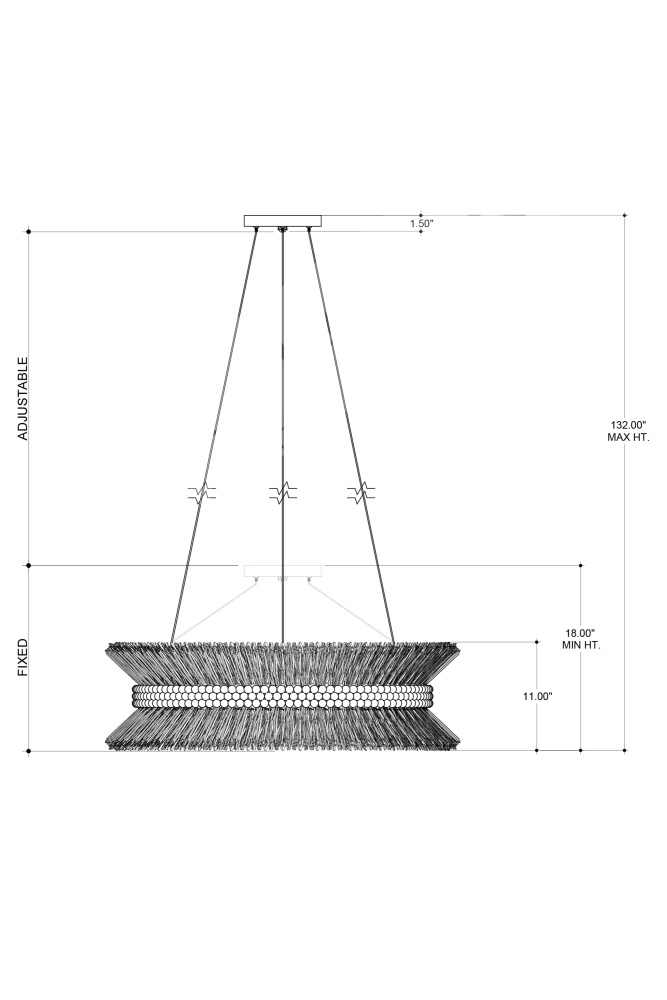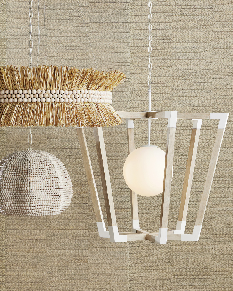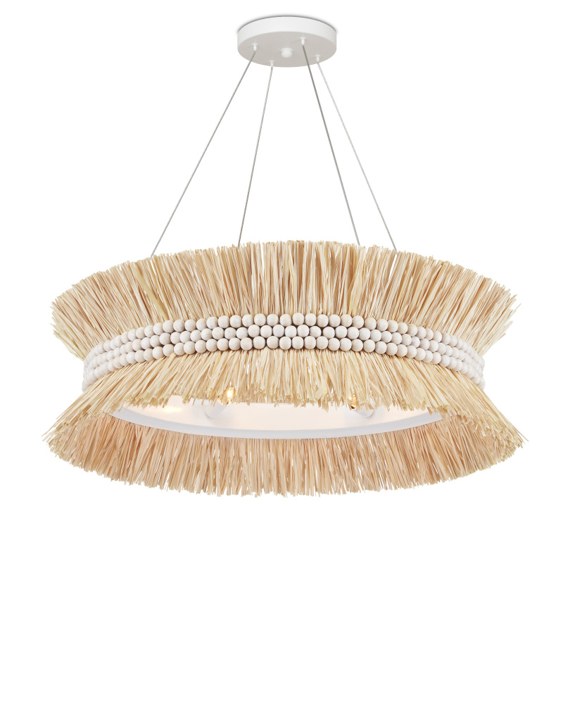 Take a trip to the beach with Jamie Beckwith. Her Seychelles Chandelier, which joins her collection of lighting, was inspired by an island-hopping vibe. The frame is made of wrought iron in a sugar white finish. From this extends hand-cut sprays of raffia that are cinched by three rows of pale hand-strung wood beads. When light wafts through the strands of the natural material harvested from palm trees, a warm glow is emitted. The aircraft cable from which the tan chandelier is hung keeps the composition airy. Adjustable from 18" to 132" with use of included chain/rod kit/cable. If your space calls for a longer drop, additional chain/rods/cable is available for purchase.