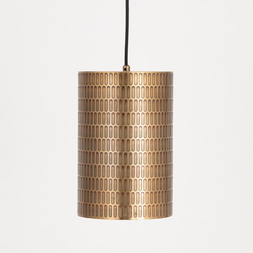 With bold geometry and a globally inspired edge, the Shaka collection makes a statement in simplicity. Each cylindrical drum shade is hand-finished in hammered metal, etched with an elongated oval pattern that adds visual rhythm and soft texture. The light