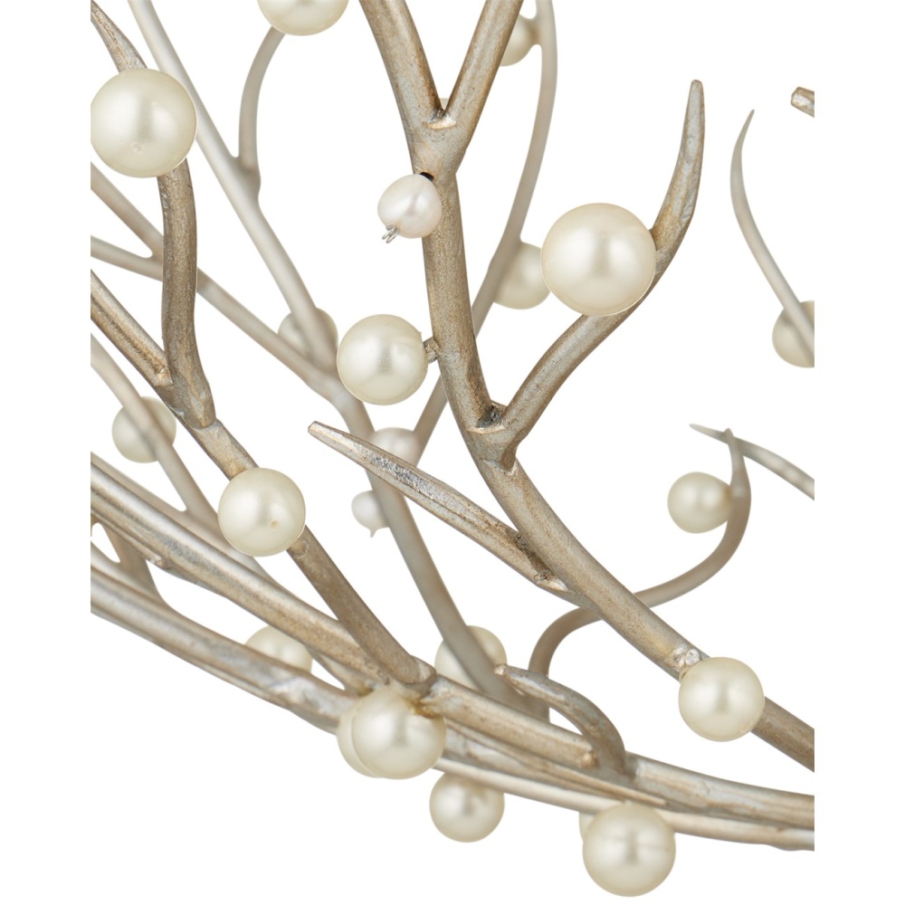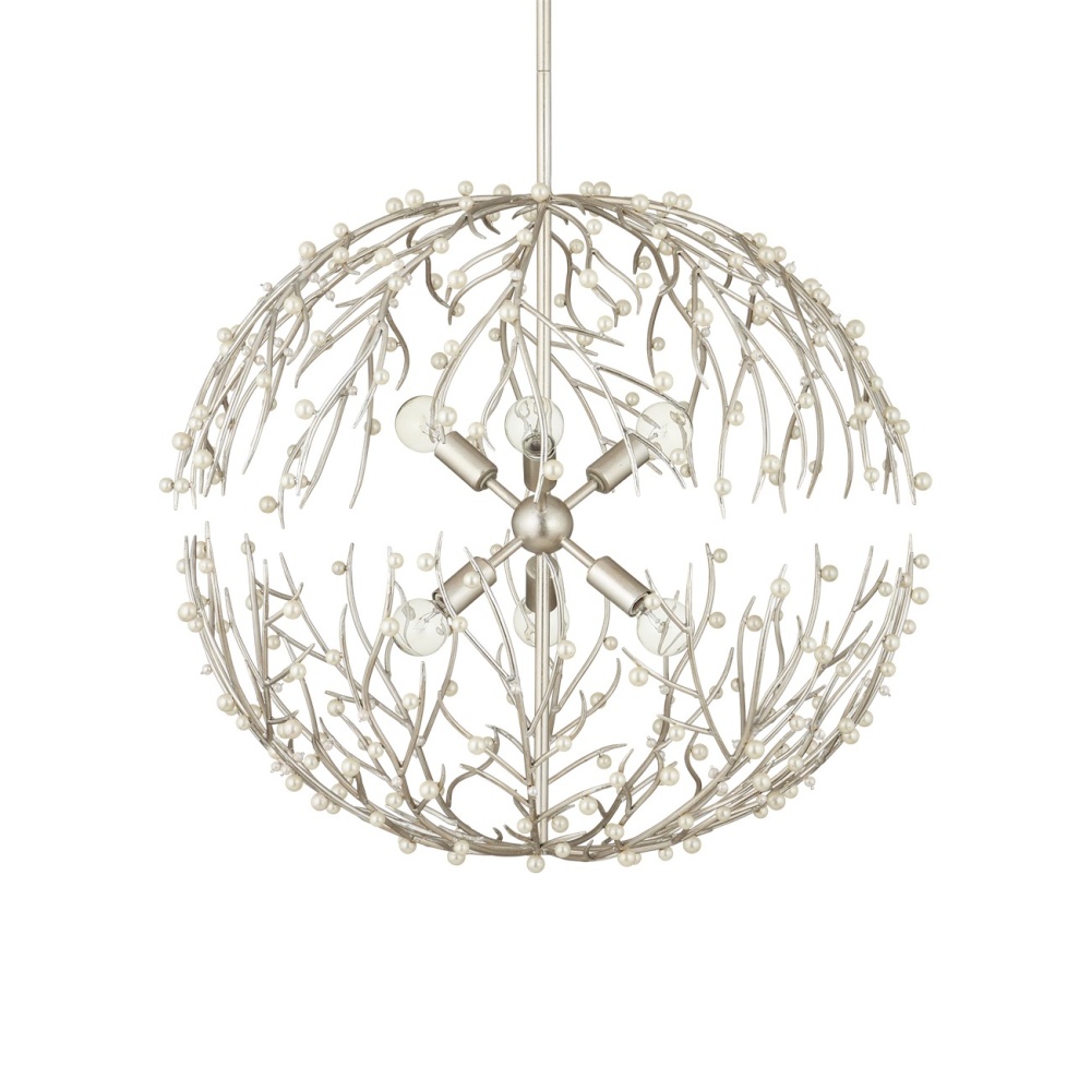 The Shinju Pearl Orb Chandelier, designed by Aviva Stanoff, draws inspiration from the natural beauty of freshwater pearls resting on flowing branches. Crafted from hand-forged wrought iron in a contemporary silver leaf finish, the chandelier’s organic frame captures the essence of an underwater seascape. Scattered along the branching form, pearl-like accents reflect the light of six bulbs, creating a soft, luminous effect. This sculptural piece blends artistry and nature in a refined, statement-making silhouette. Adjustable from 30" to 72" with use of included chain/rod kit/cable. If your space calls for a longer drop, additional chain/rods/cable is available for purchase.
