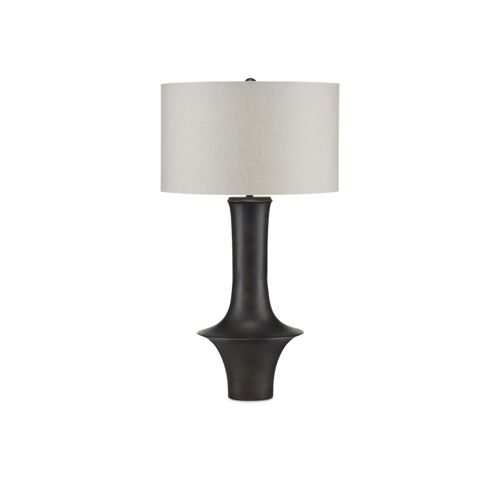 The Silvestri Black Table Lamp, with its flaring shape that straddles the mid-century modern and industrial design eras, is made of cast aluminum in a matte black finish. The surface has a subtle pitting that was achieved through a sandcast method. The natural linen shade brings the black table lamp even more texture and heightens the warmth of the overall composition.