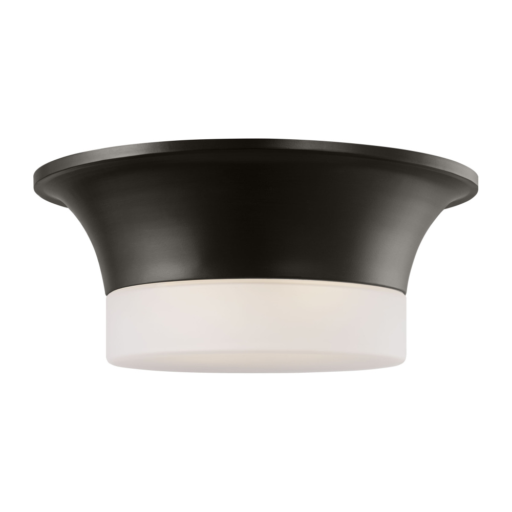 The Sina flush mount by Alexa Hampton plays with proportion through a shallow cylinder and generous flared silhouette. The striking contrast between the dark metal band and white glass diffuser is complemented by a softly cast glow. Available in two finishes, the Sina flush mount silhouette will fit effortlessly into any room.