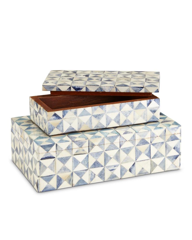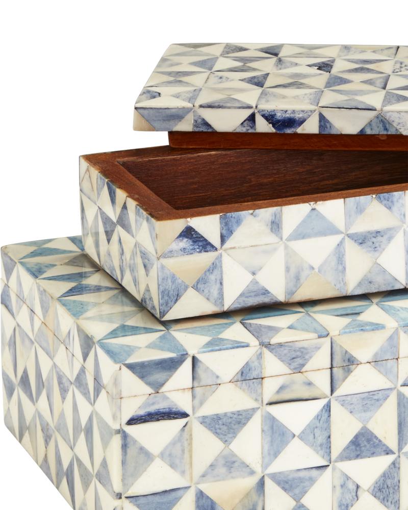 The Sky Blue Box Set illustrates the talents of the artisans who create the surfaces of these white decorative boxes. The mosaics in white and blue bone are painstakingly arranged and affixed to the wood boxes. The patterns achieved by the triangular shaped segments bring this white decorative box a textural feel while the patina washed on top gives it an aged appeal.
