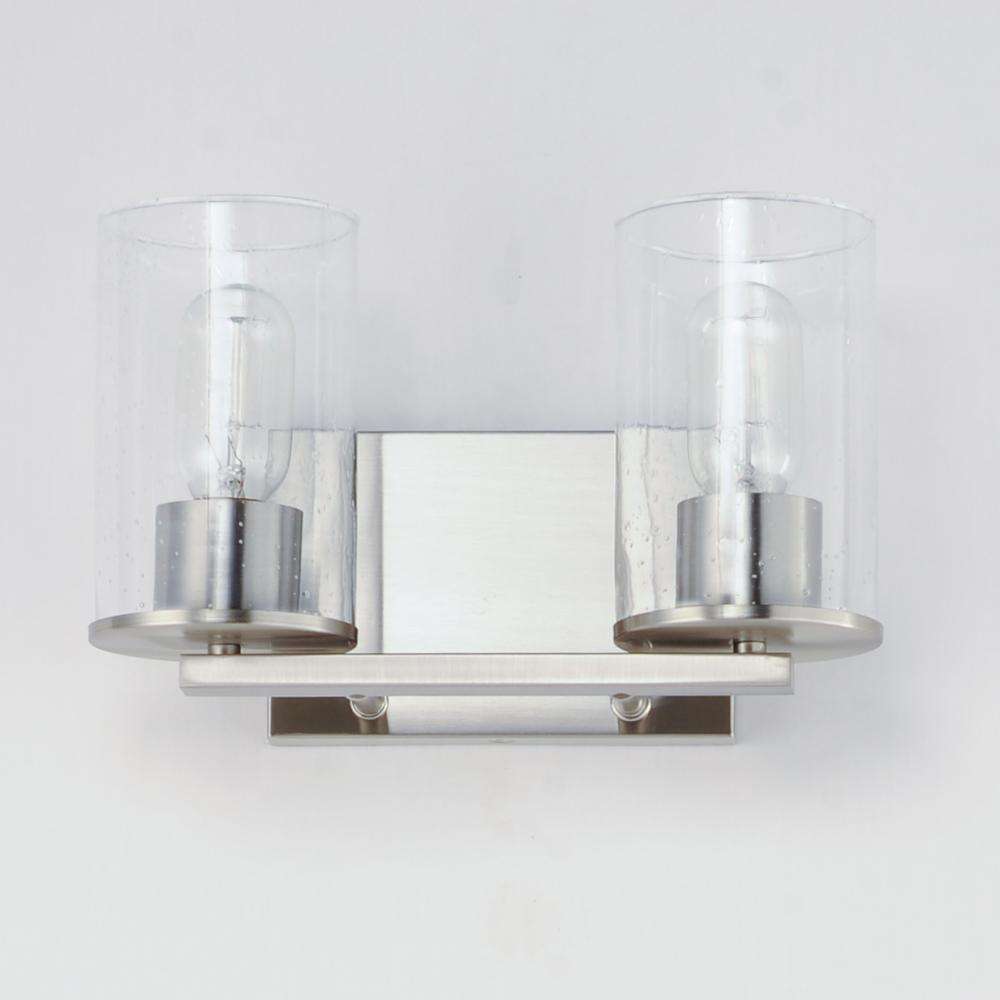 Cylinders in Clear Seeded glass on simple Satin Nickel frames or matte Black frames with Antiqued Brass socket covers. Pivoting arms on chandelier allow it to direct light up or down. Use filament lamps either tubular or Edison in shape for a Coastal or In