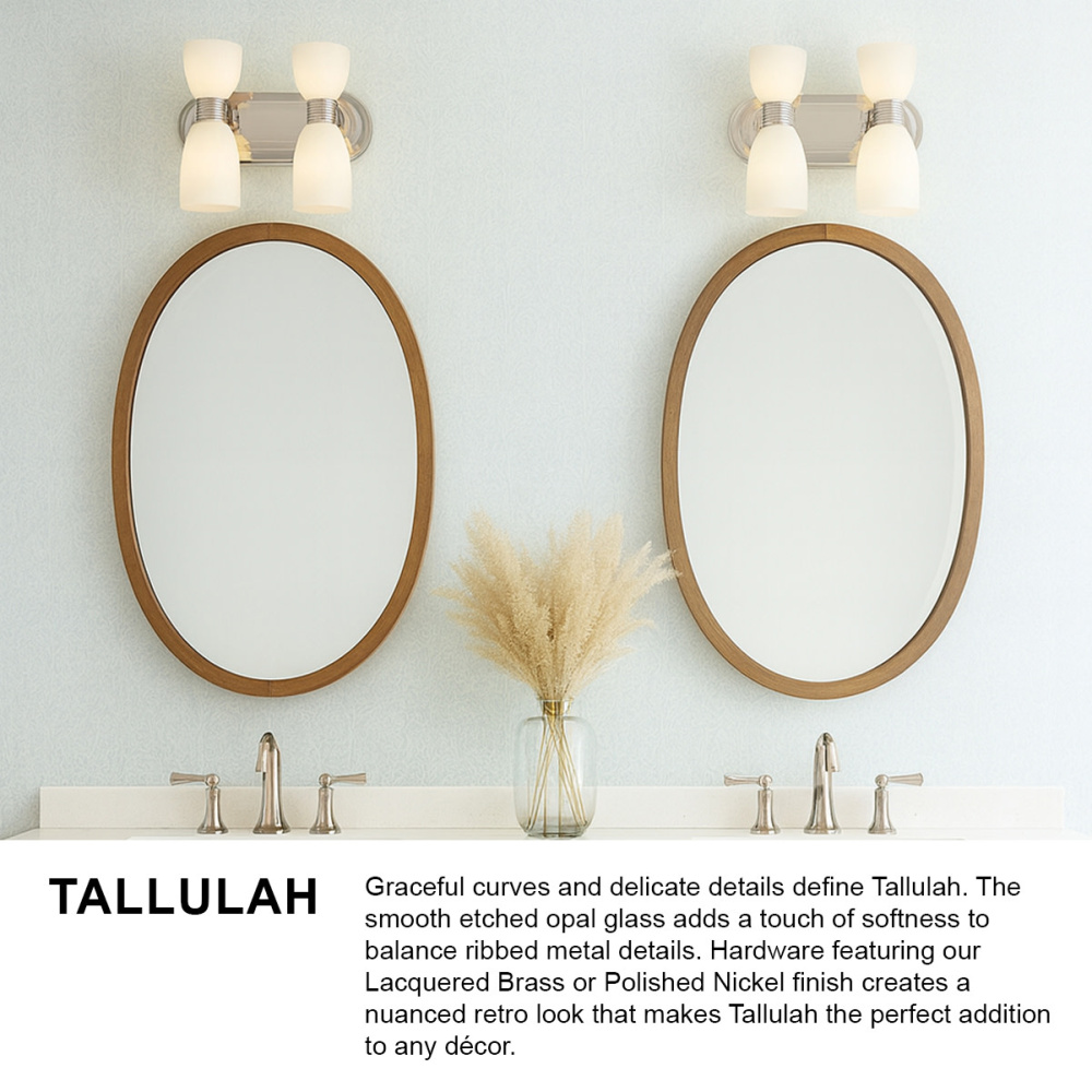 Graceful curves and delicate details define Tallulah. The smooth etched opal glass adds a touch of softness to balance ribbed metal details. Hardware featuring our Lacquered Brass or Polished Nickel finish creates a nuanced retro look that makes Tallulah the perfect addition to any décor.