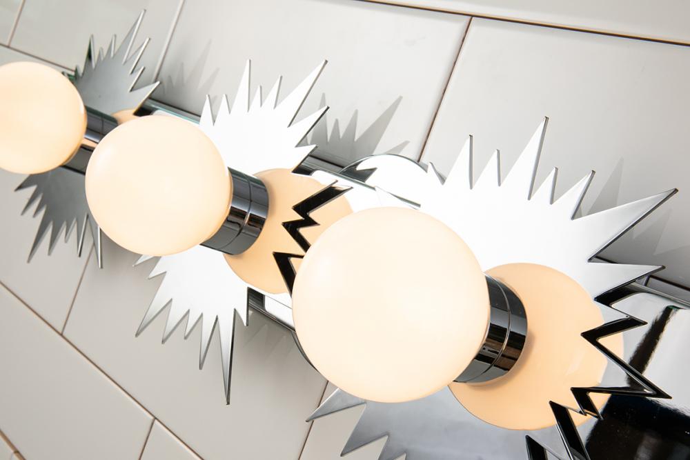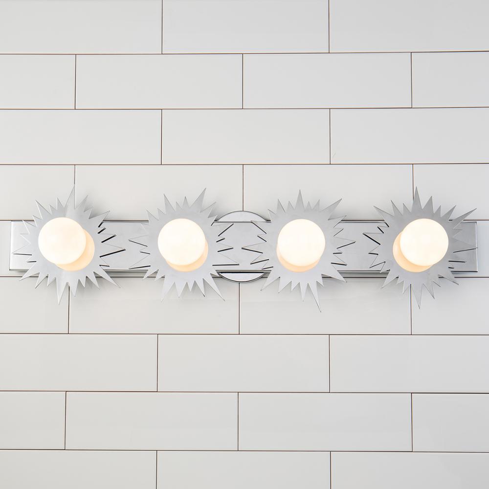 A 32" x 8.5" x 4.5" sun-shaped 4-light vanity in polished chrome. Ideal over mirrors or double sinks, it brings whimsical drama and style to bathrooms.