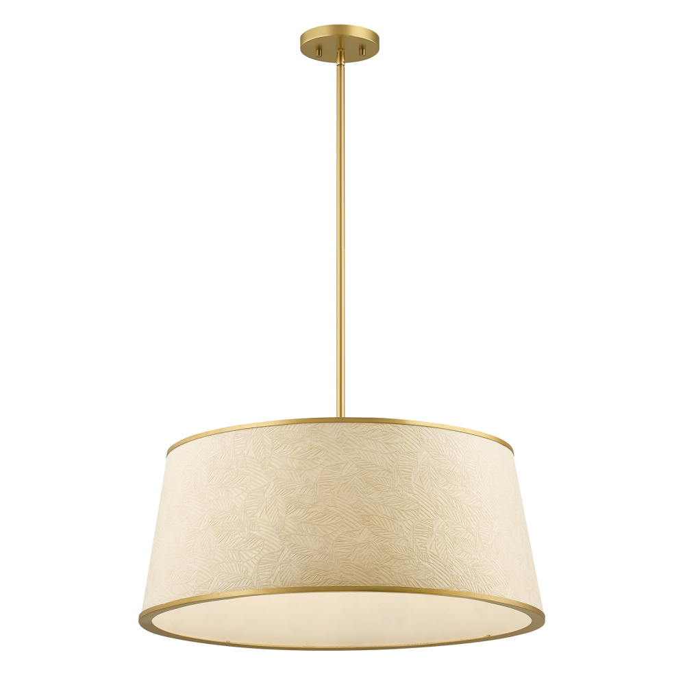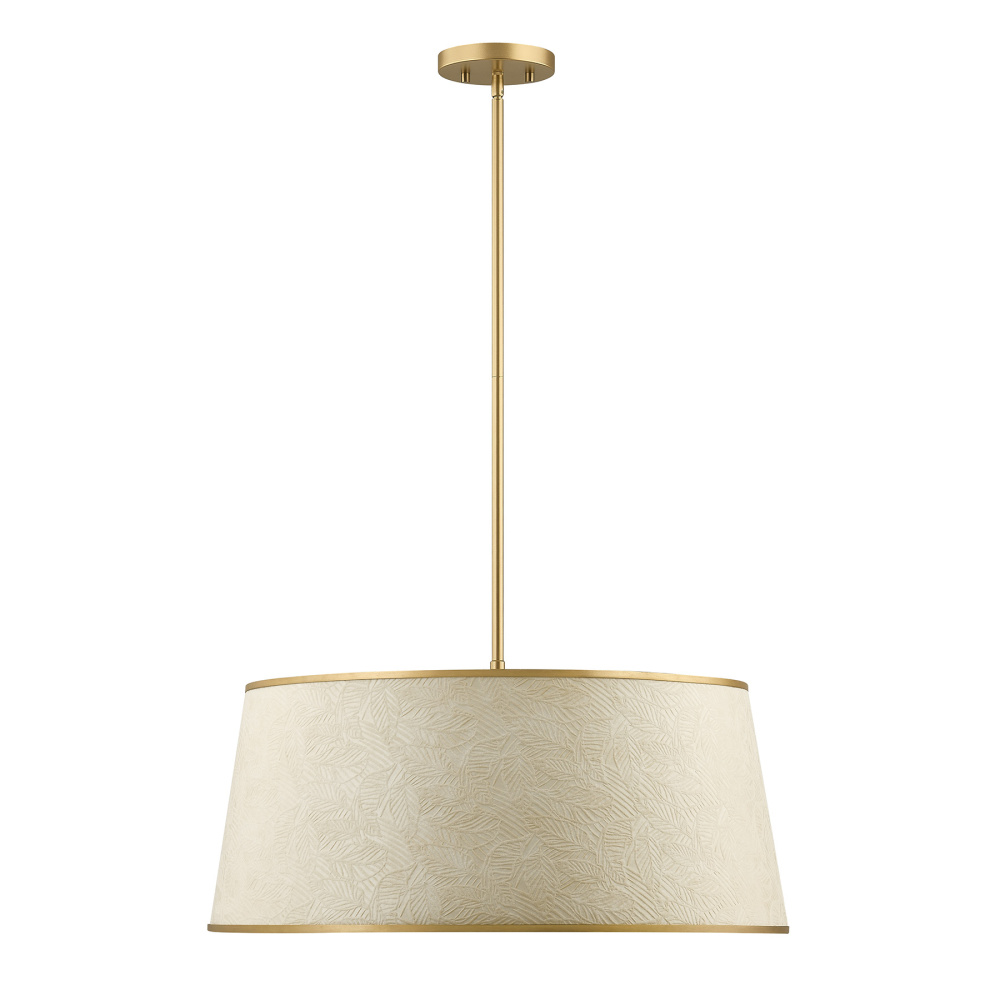 The Savoy House Sombra 6-light pendant was designed by award-winning interior designer and TV host Breegan Jane. Get a comfortable, wide-spread glow from the paper shade, which is embossed with a subtle leaf motif to bring gentle texture. The Spun Gold finish heightens its warm, welcoming feel. Sombra is 24" in width and has an adjustable height ranging from 11" to 65". It uses six candelabra size bulbs of up to 60 watts per bulb. Bulbs not included. Comes with four 12" downrods and one 6" downrod.