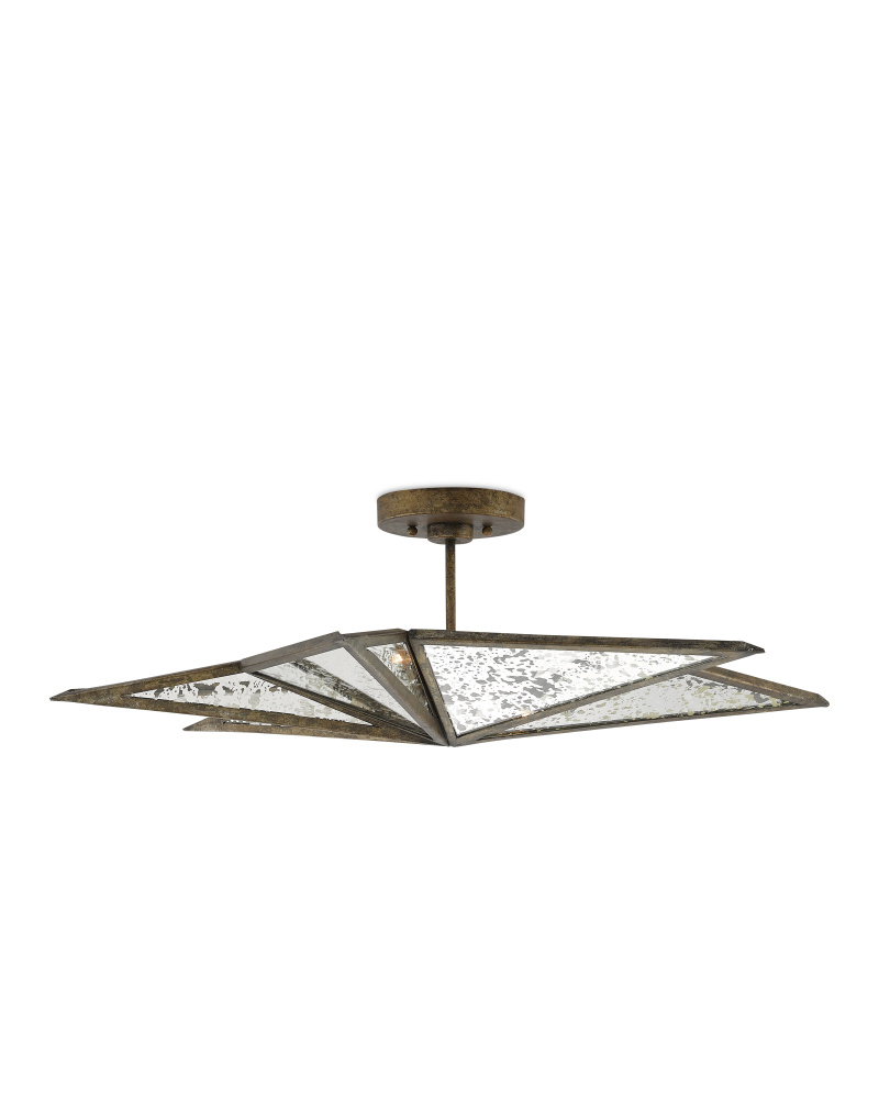 The distinctive shape of the Stargazer Semi-Flush Mount made of wrought iron and raj mirror will bring celestial dreams to anyone sleeping under it! The mirrored panels edged by a Pyrite bronze finish will catch any illumination to create their own heavenly light whether it’s sunlight or moonbeams that reflect from their surfaces.