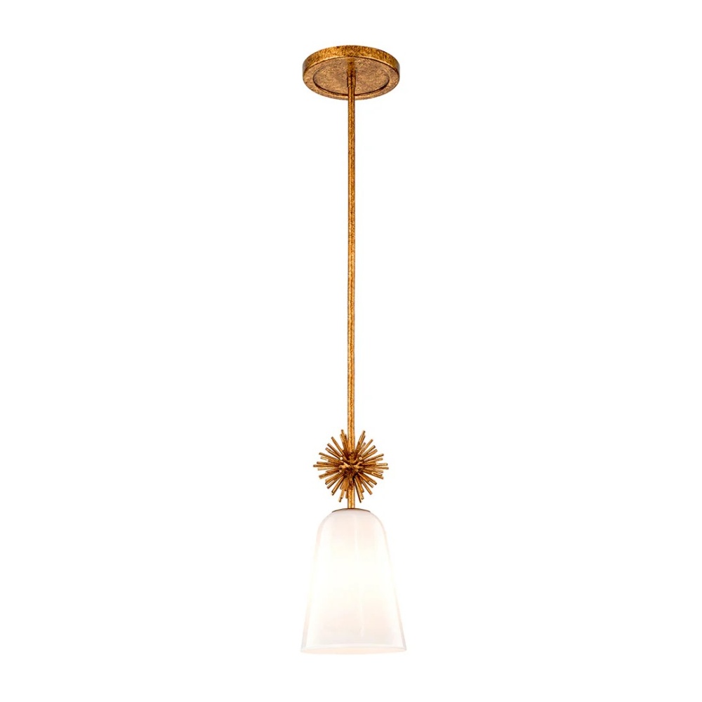 The Staring 1 Light Mini Pendant is 10" wide and finished in antiqued gold leaf. It offers adjustable height options when mounted. The glass is an Opal white.