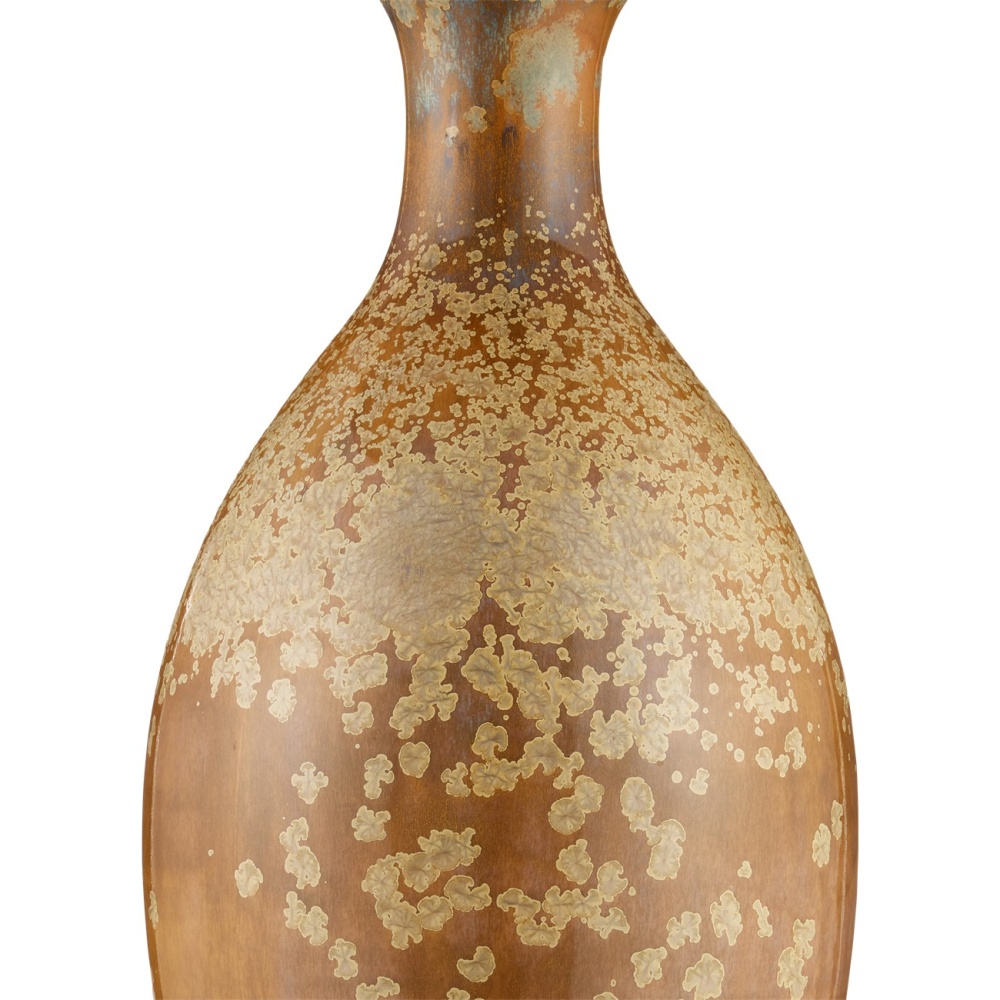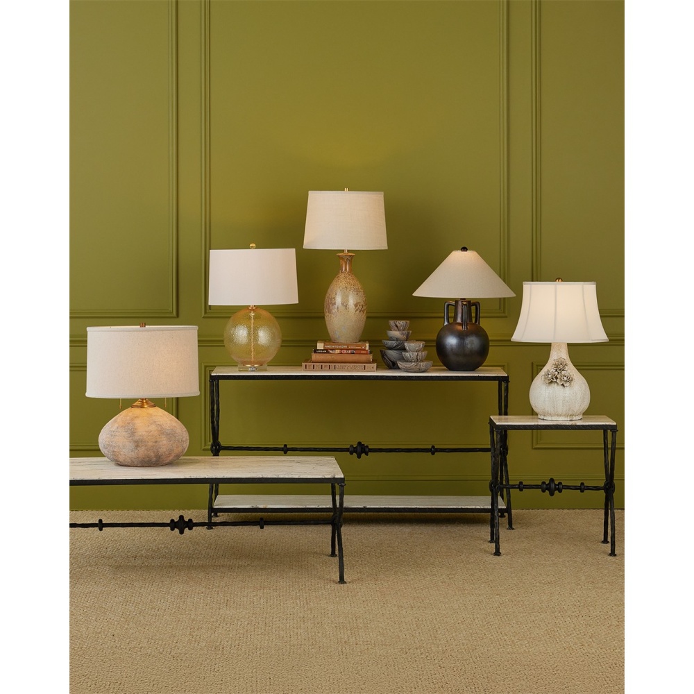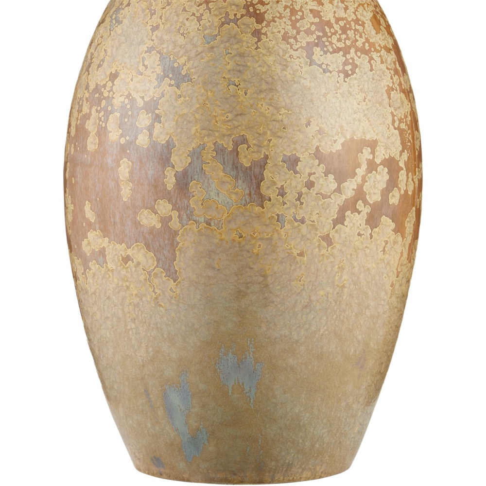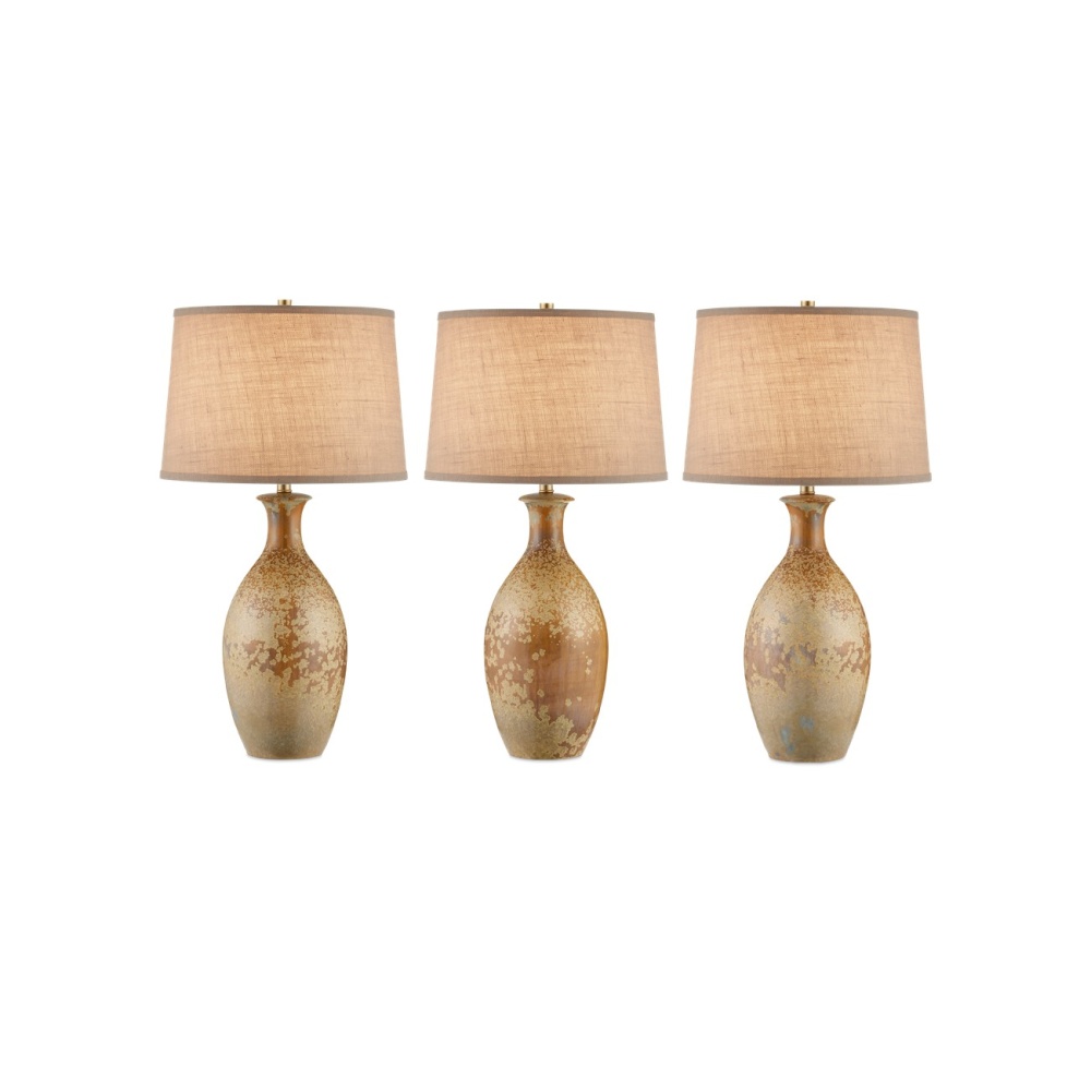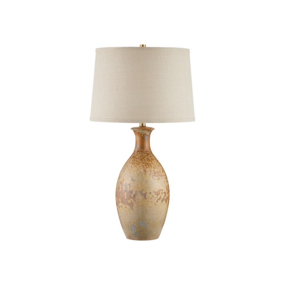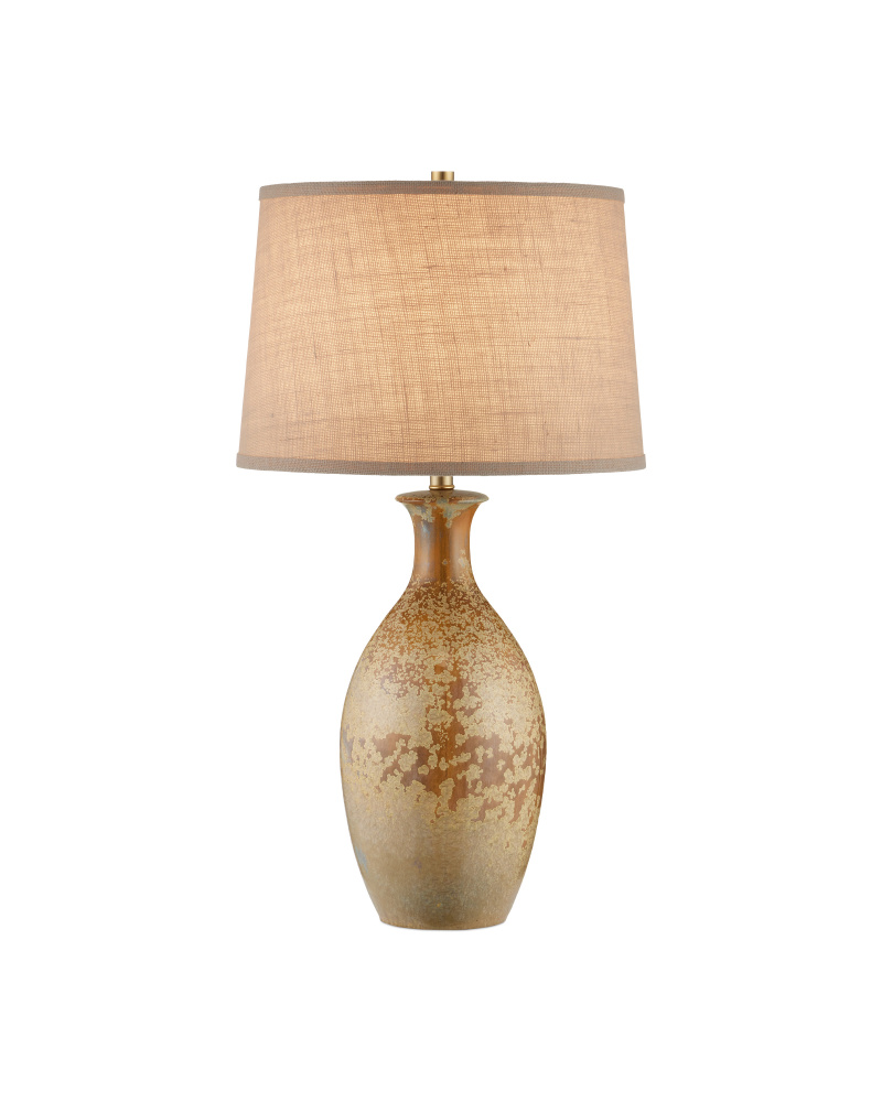 The speckled effect on the Stellata Table Lamp is known as crystallization, which occurs when multiple layers of glaze, each of a different color, are applied. When they blend together during the firing process, minerals in the glazes react to the high temperatures in the kiln and form tiny crystals on the surface. These add texture and sparkle to the glaze, enhancing its visual interest. No two of these lamps, which are fitted with burlap shades with a self-trim, will look alike.
