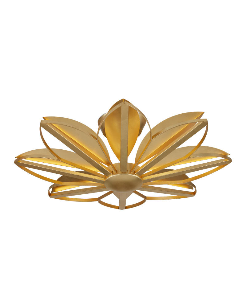 The Stewart Semi-Flush is an artistic exploration of metal with its arcing bands that mimic the shapes of the leaves resting above them. Designed as a nod to botanicals, this fixture is covered in a brilliant gold leaf finish. Bouncing light onto the leaves while simultaneously reflecting it onto the ceiling to create a warm glow was the aim with this nature-inspired gold semi-flush.