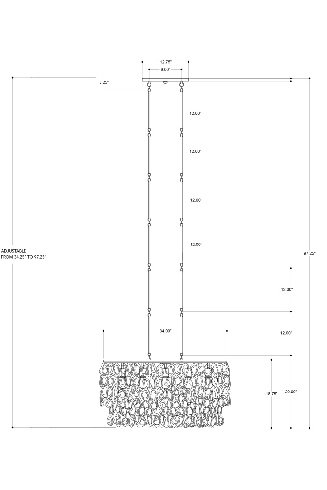 The Stillwater Oval Chandelier dangles strands of hand-selected oyster shells from a wrought iron frame in a blacksmith finish. This versatile shell chandelier illustrates the artistry with which our design team approaches natural, nautical materials. Adjustable from 34.25" to 97.25" with use of included chain/rod kit/cable. If your space calls for a longer drop, additional chain/rods/cable is available for purchase.