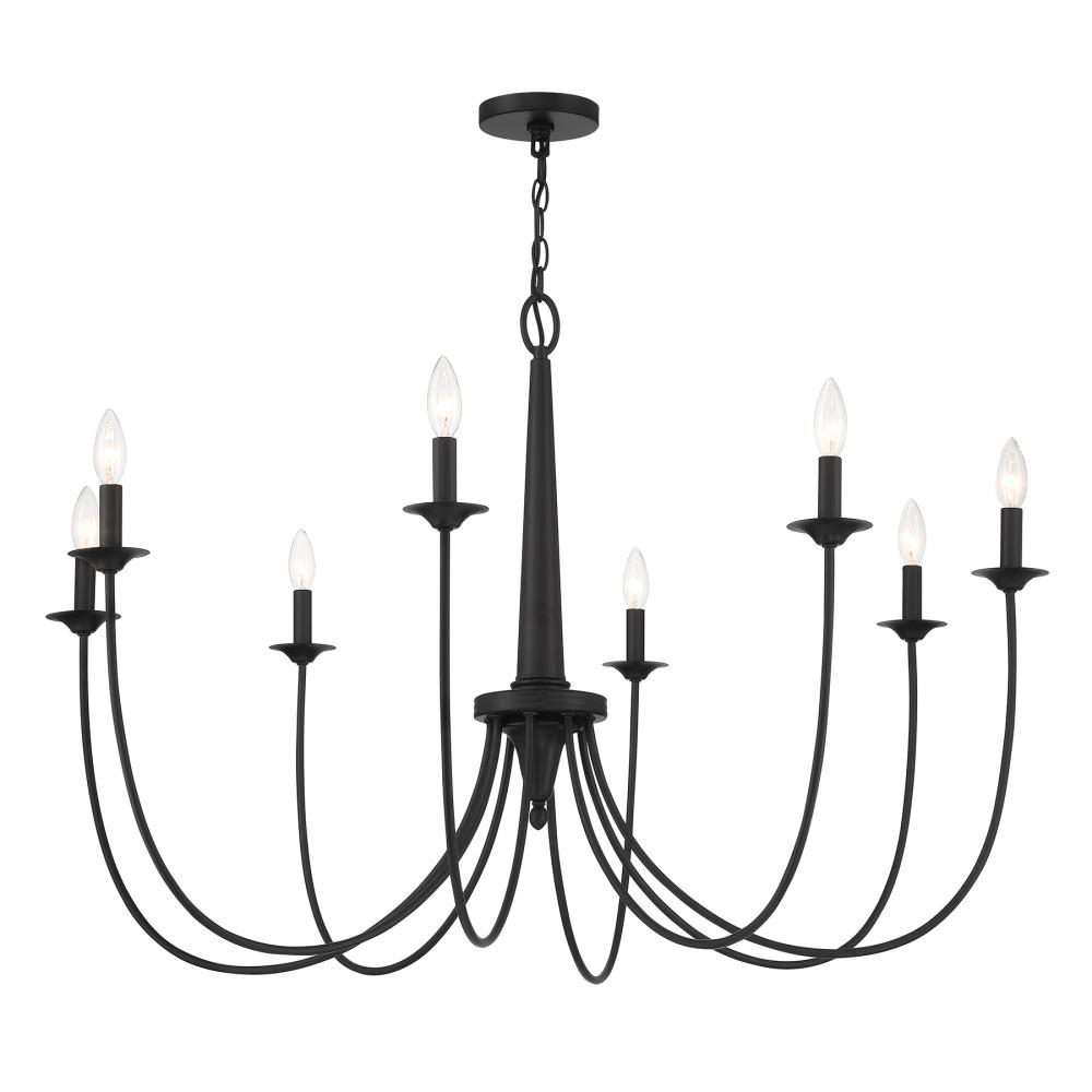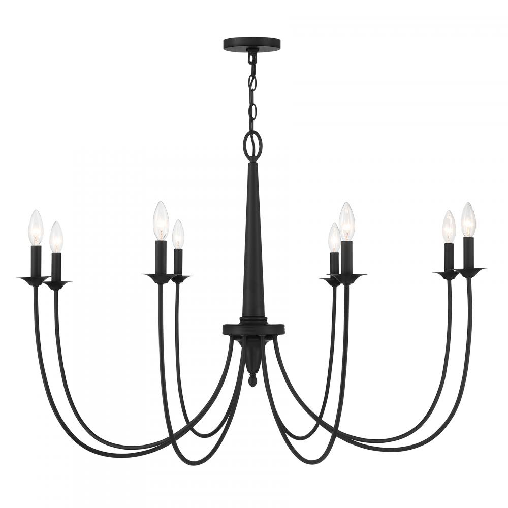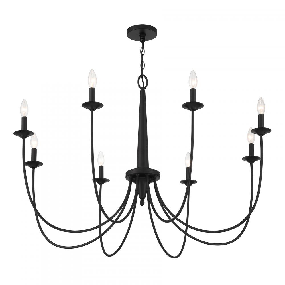 From Savoy House, the Stonecrest 8-light chandelier is a superb way to adorn your home with rustic yet dramatic style. Slim, dramatically curving arms showcase minimal yet beautiful candle cups. The central column also features a thoughtful touch of down-home detailing. It's all decorated in Matte Black. Bryant is 28" in height and 42" in width. Uses eight candelabra size bulbs of up to 60 watts per bulb. Bulbs not included.