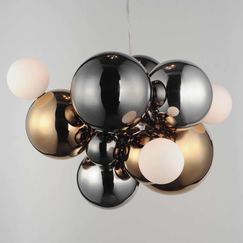 Evocative of turbulent skies, Stormy is a sculptural masterwork that transforms negative space into visual drama. A billowing cluster of stainless-steel spheres, finished in a moody interplay of Black Nickel, French Gold, and Polished Chrome, creates an ab