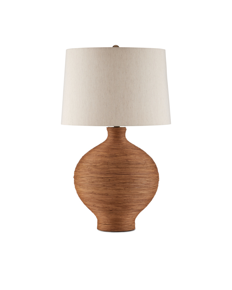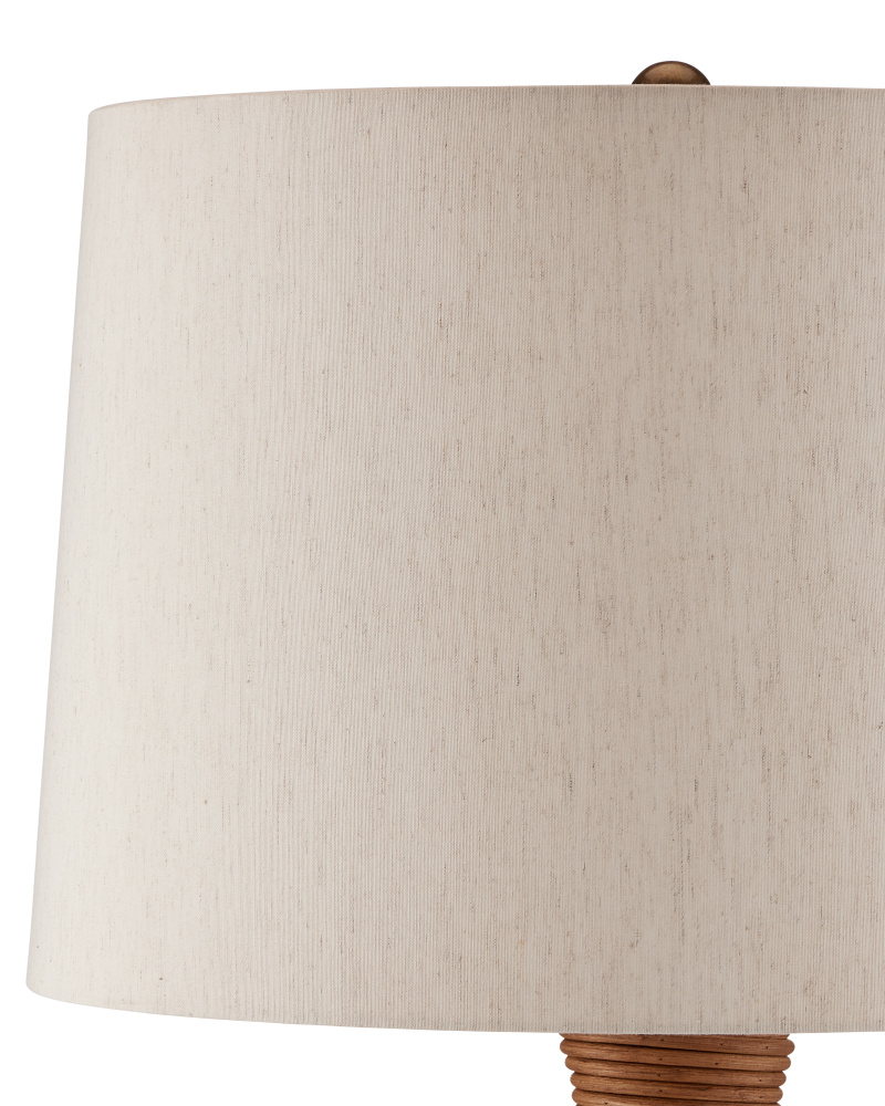 The Susel Table Lamp is handmade through a painstaking process whereby artisans take strips of rattan without the skin and wrap it seamlessly around the contemporized ginger-jar shape. Achieving such a uniform linear feel is a true feat. Complementing the warmth of the natural material is the nubby shade, and the hardware and finial in an antique brass finish.