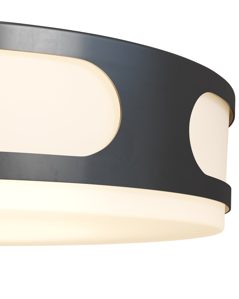 The Swale Outdoor Flush Mount has a graphic silhouette with cut outs where illumination can escape. The sides of the black flush mount are covered with a milky white glass that illuminates uniformly when the integrated LEDs shine through it. The metal is powdercoated to make this outdoor flush mount weather-worthy.