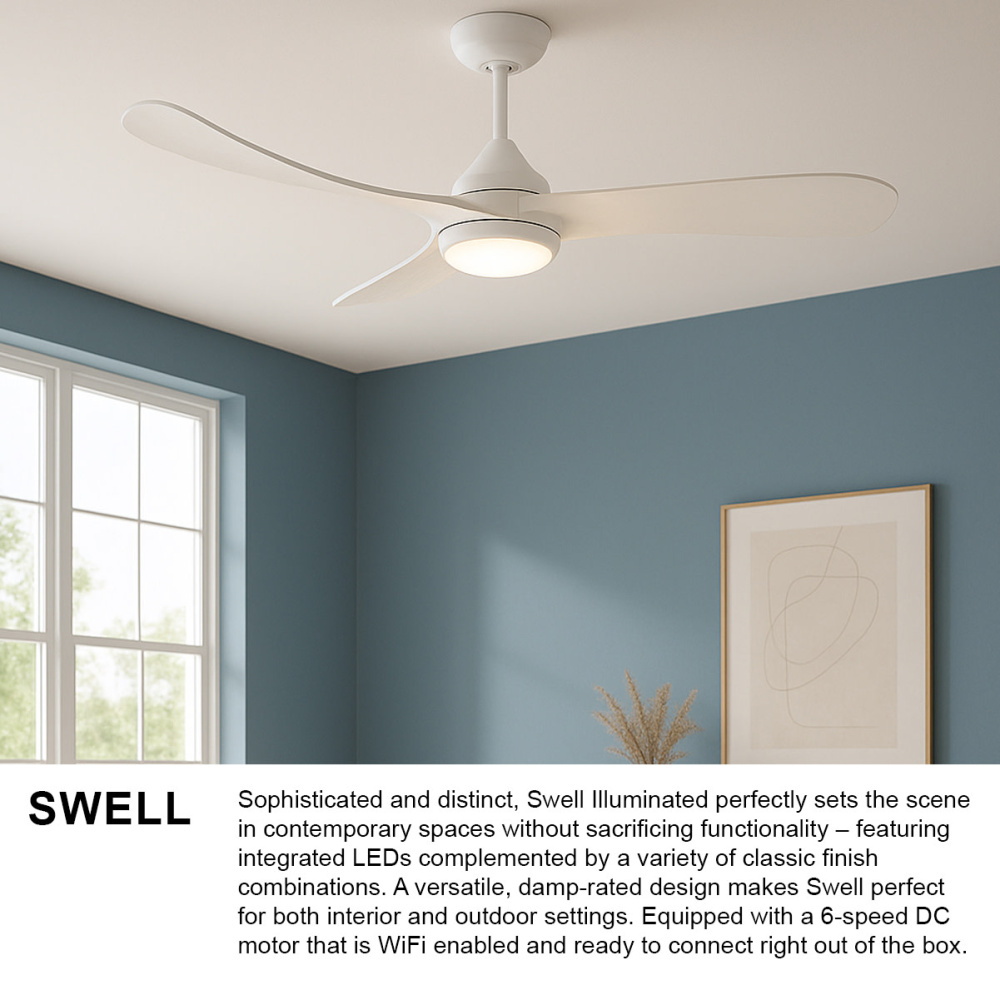 Sophisticated and distinct, Swell Illuminated perfectly sets the scene in contemporary spaces without sacrificing functionality - featuring integrated LEDs complemented by a variety of classic finish combinations. A versatile, damp-rated design makes Swell perfect for both interior and outdoor settings. Equipped with a 6-speed DC motor that is WiFi enabled and ready to connect right out of the box. Operated by the HIRO control or WiFi compatible with the Hinkley app.