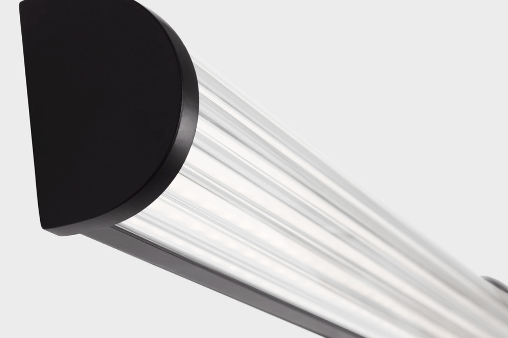 Syden is crafted of steel With clean-lined backplate and ridged glass shade. This understated detailing makes for a versatile design, at home in either modern, transitional or traditional interiors. Syden can be mounted horizontal or vertical.