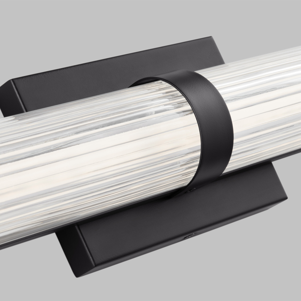 Syden is crafted of steel with clean-lined backplate and ridged glass shade. This understated detailing makes for a versatile design, at home in either modern, transitional or traditional interiors. Syden can be mounted horizontal or vertical.