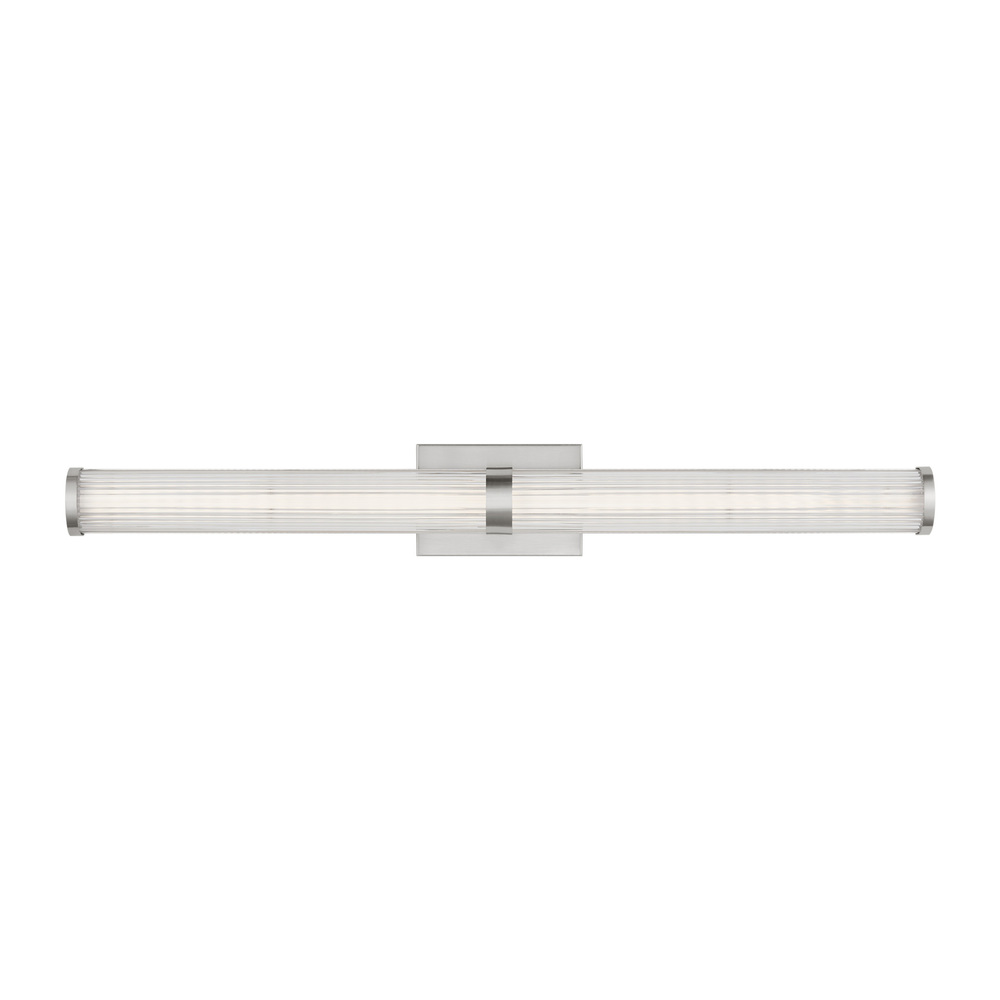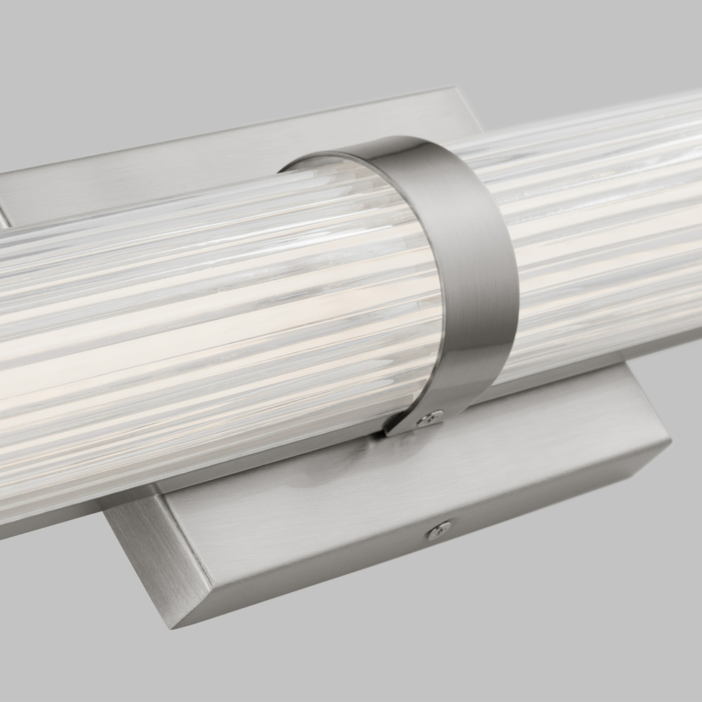 Syden is crafted of steel with clean-lined backplate and ridged glass shade. This understated detailing makes for a versatile design, at home in either modern, transitional or traditional interiors. Syden can be mounted horizontal or vertical.