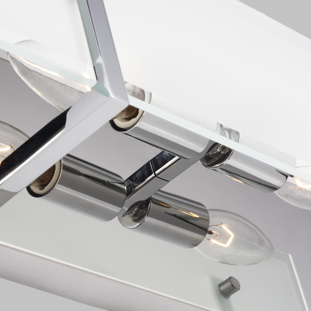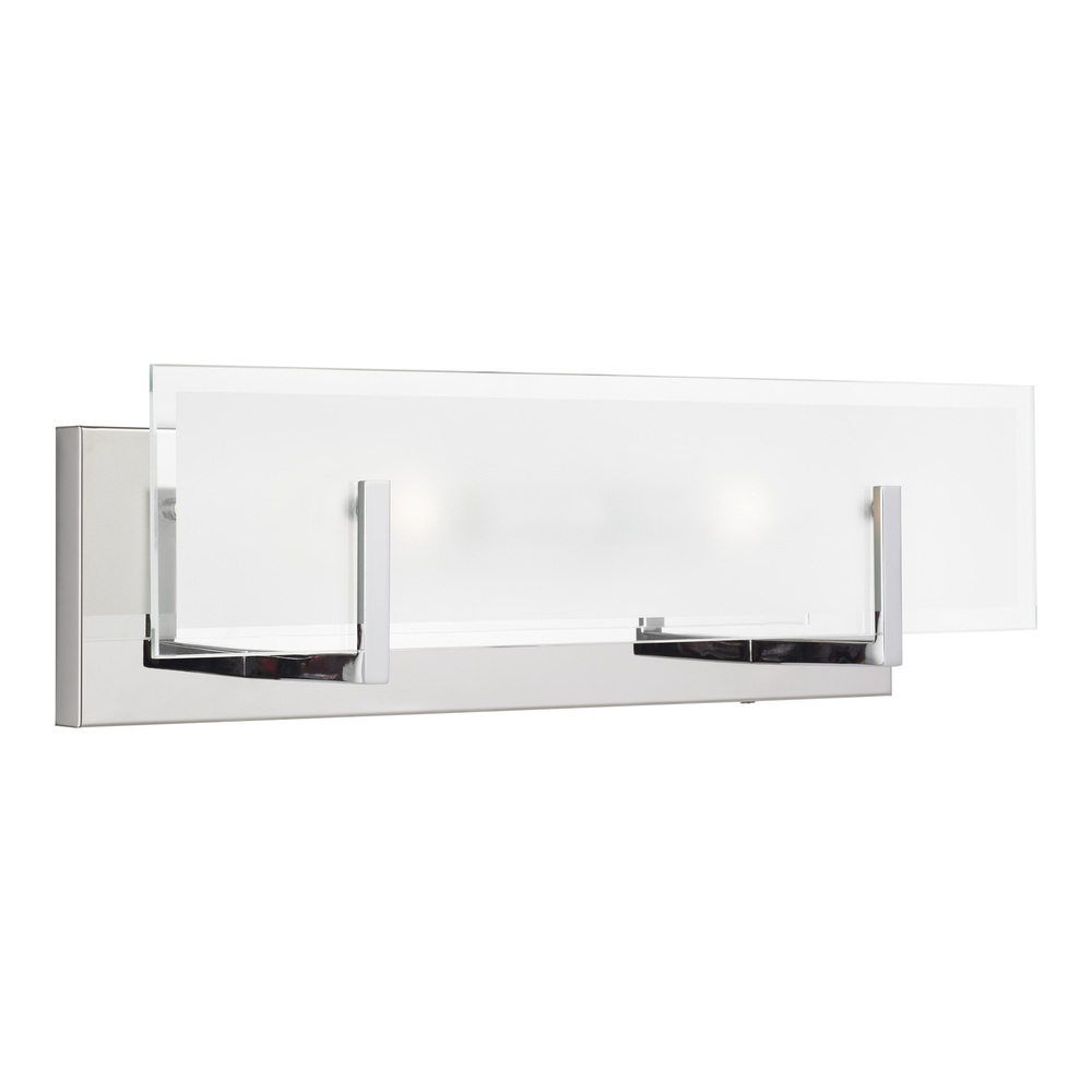 The Syll two light vanity fixture in chrome offers shadow-free lighting in your powder room, spa, or master bath room. Syll features a stylish frame with brilliant frosted beveled glass panels.