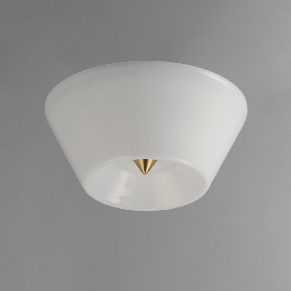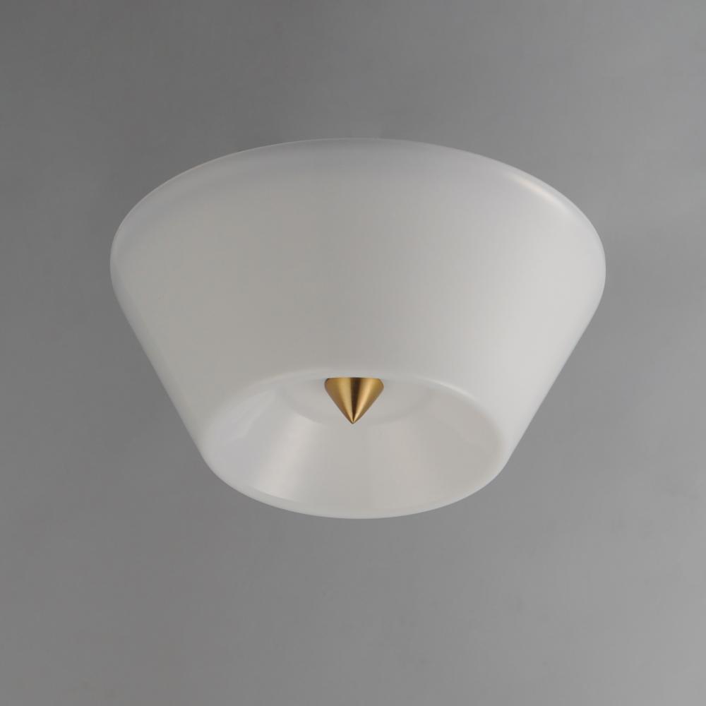 Accentuating the cone shape, this LED surface mounted fixture features a tapered glass shade and is supported by a conical finial in complementary finishes. Available in Polished Chrome, Matte Black, or Natural Aged Brass this simple design adds flair to a
