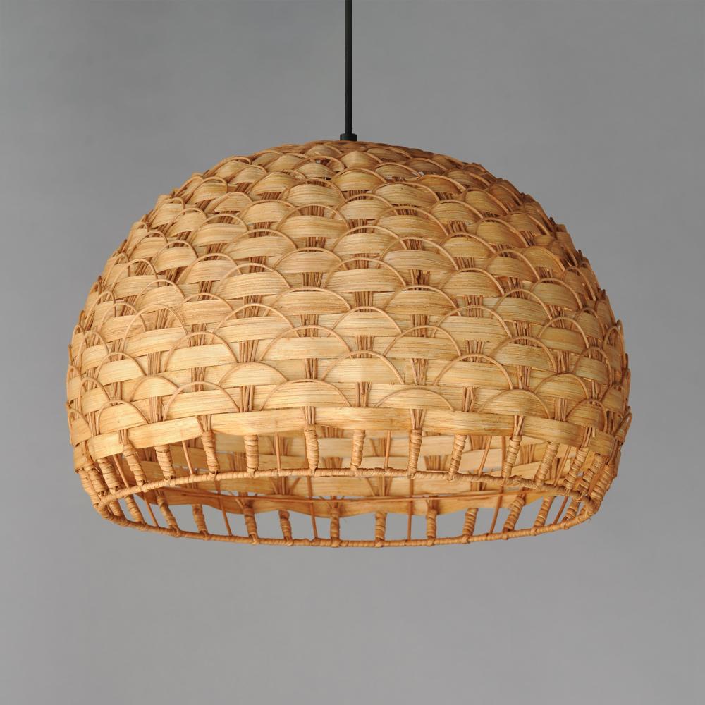 Strips of fine bamboo are handwoven into oblong globe pendants, forming a layered filigree that balances craftsmanship with natural warmth. Light gently escapes through the open weave, casting intricate patterns that shift with the time of day. Available i