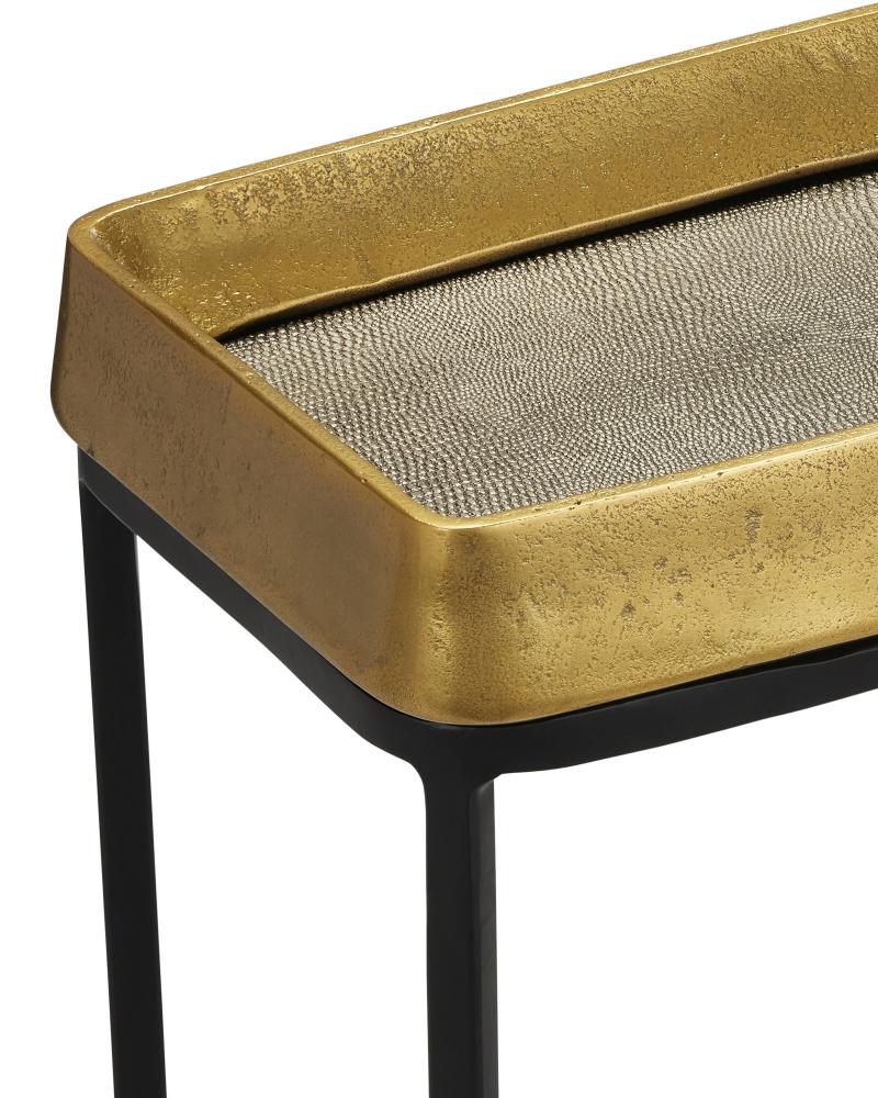 The Tanay Brass Side Table is not shy when it comes to infusing a space with an incredible mix of textures. Not only does the cast aluminum top have tell-tale pitting on the surfaces of its gleaming gold interior and exterior edge, the bottom of its tabletop is stamped in a snakeskin pattern in a graphite finish. This masterpiece of artistry sits atop a black iron base that is minimal to allow the artisanal top to be the scene-stealer.