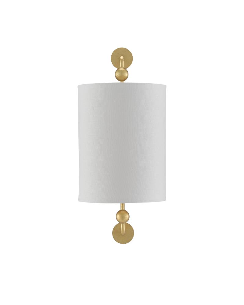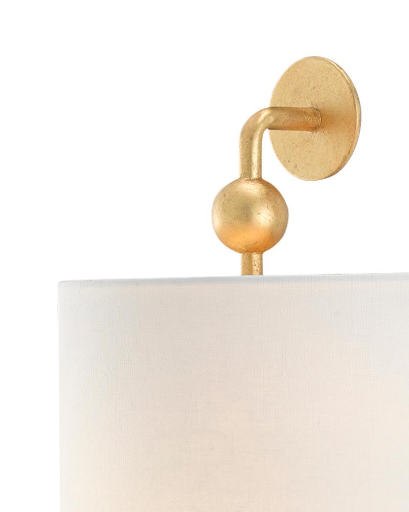Tiny globes ornament the arms that affix the off-white linen shade to the Tavey Gold Wall Sconce. Made of wrought iron in a contemporary gold leaf finish, the stylish gold sconce meets ADA requirements.