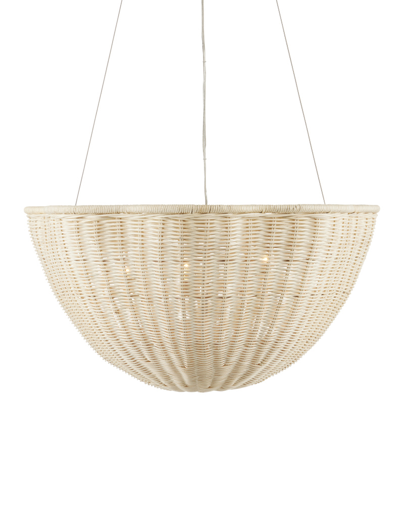 The Telos Pendant is made of wicker that has been bleached for a lighter feel. The beige pendant is perfect for spaces where an abundance of uplight is needed. The wicker pendant with its bowl-shaped profile is scalloped, though this is not obvious when viewed from the side. Given the nature of the woven natural material, pinpoints of light will waft through in spots. Adjustable from 28" to 128" with use of included chain/rod kit/cable. If your space calls for a longer drop, additional chain/rods/cable is available for purchase.
