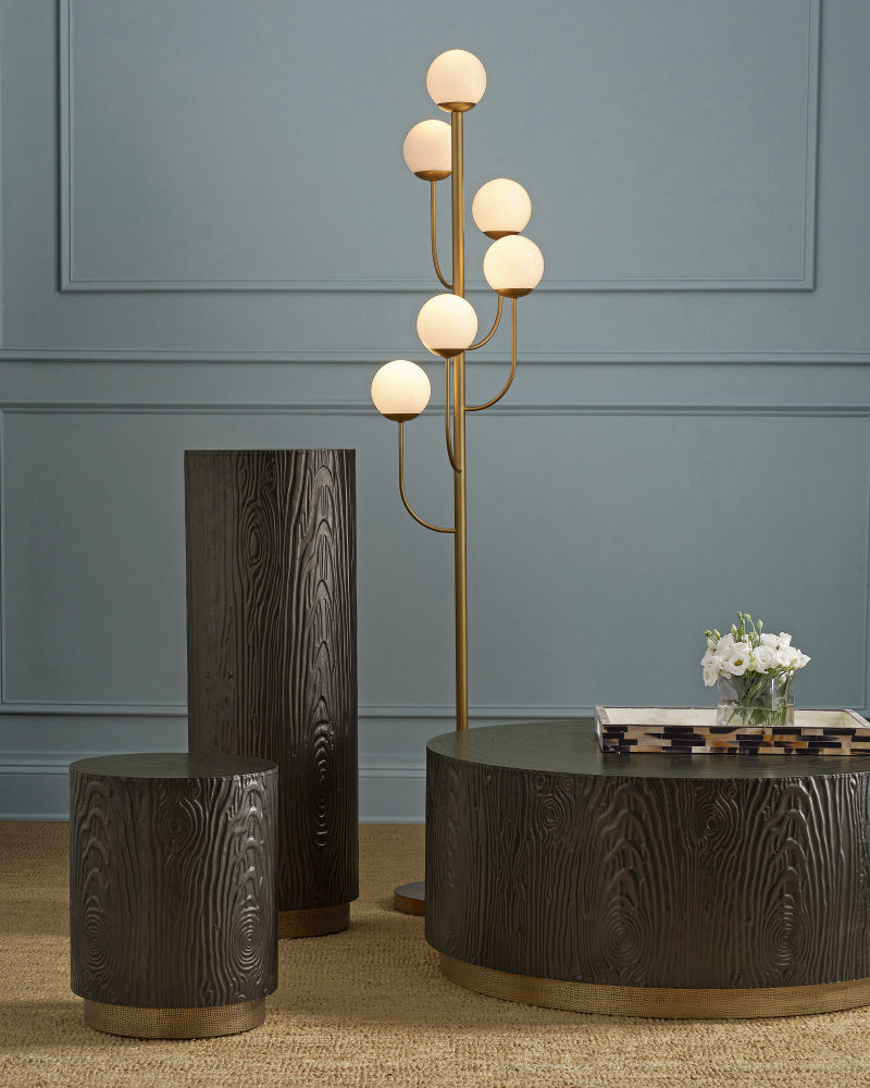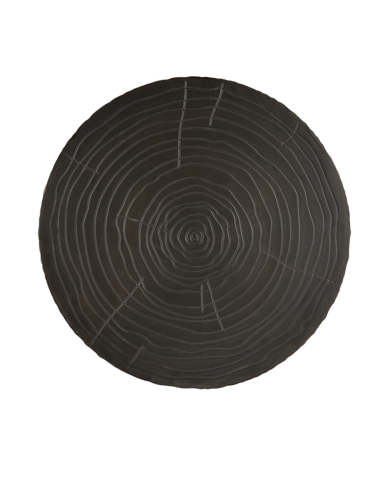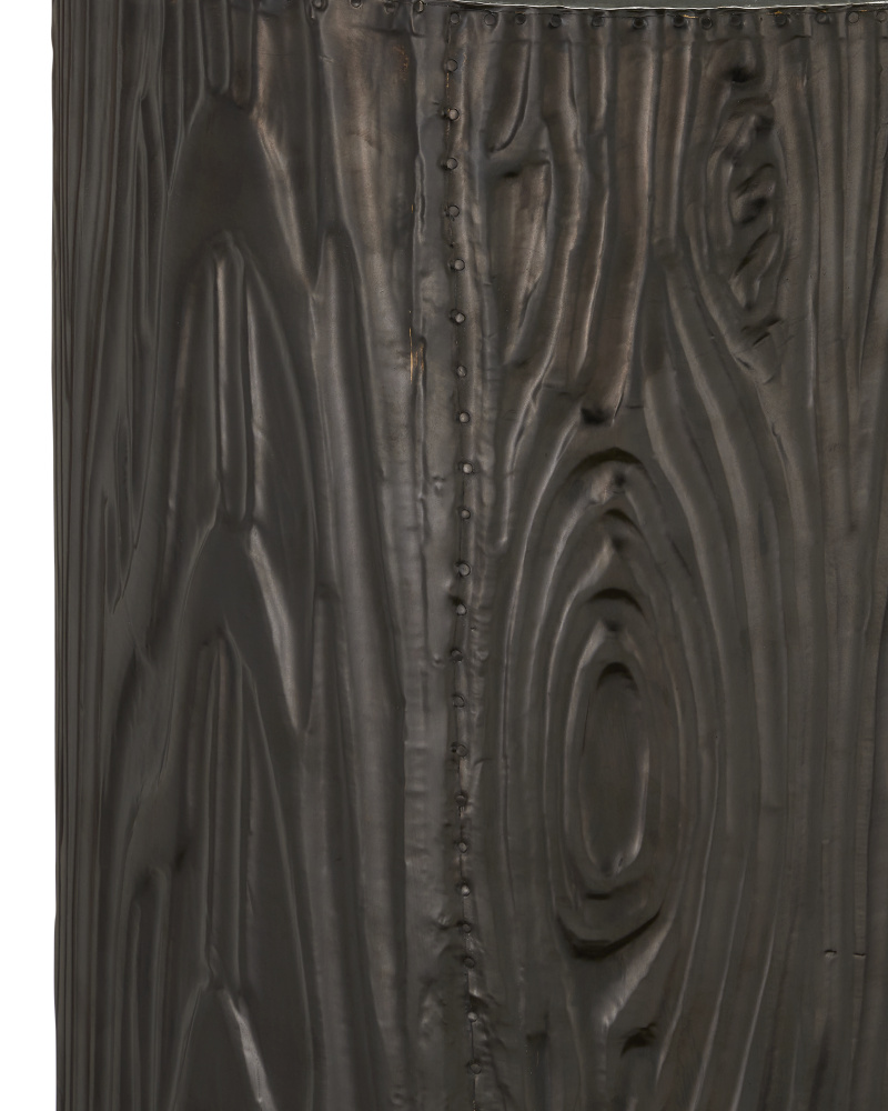 The Terra Pedestal convinces the eye that it is made entirely from natural wood, but in fact its surface is metal that has been wrapped over a hand-carved wood substrate and pushed into place to amplify a natural grain pattern. Once the dynamic ornamentation has been fully achieved, the top columnar portion is bronzed while the inset base is made of brass that has been lightly texturized. This is a truly artisanal piece.