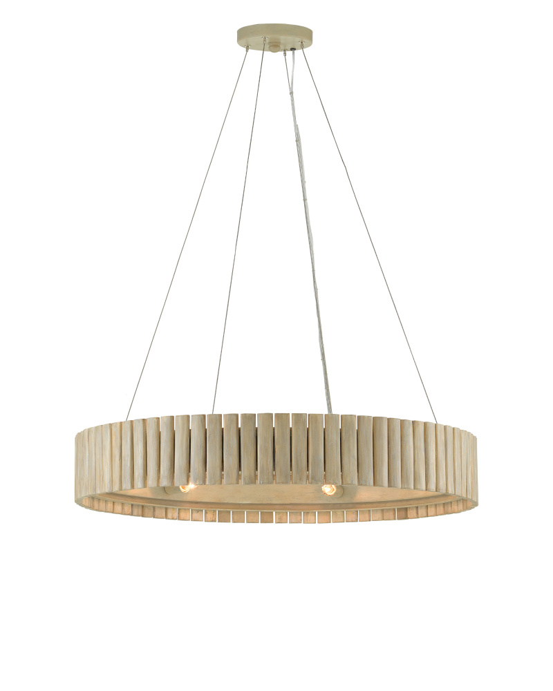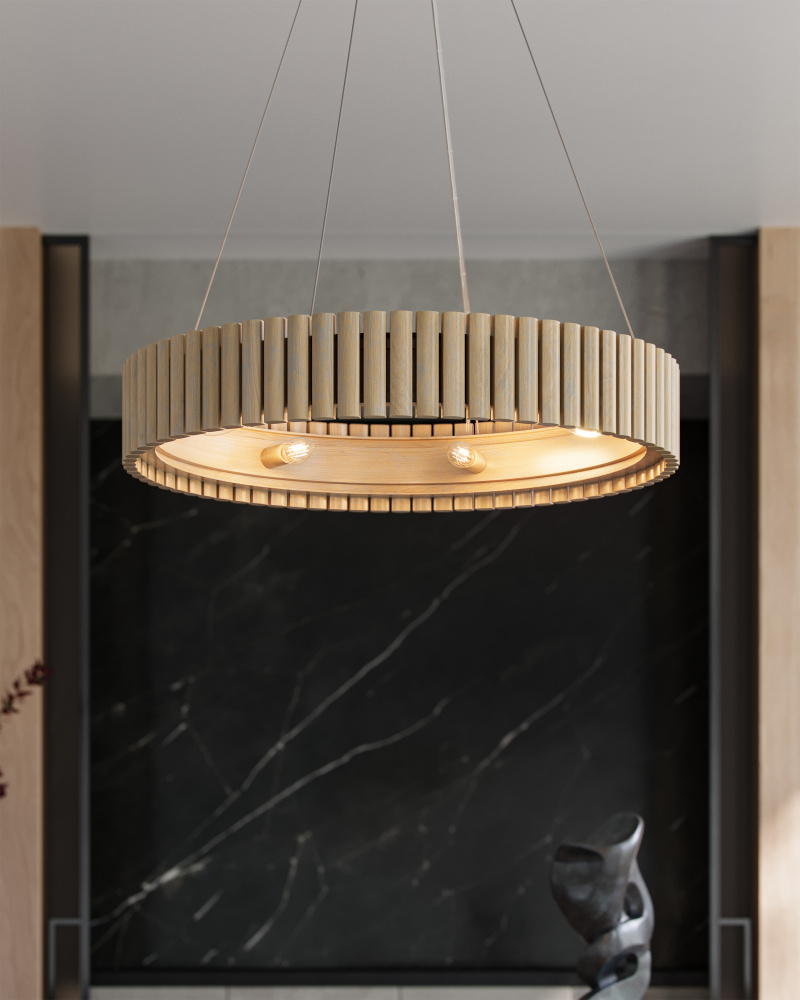 Sustainable materials and modern natural style were the inspirations for the Tetterby Chandelier. This dynamic-looking ring chandelier is made from natural bamboo in a smokewood finish for a whitewashed affect. The bamboo chandelier has aircraft style cables for suspension, which bring it the effect of floating in its surroundings. Adjustable from 22" to 94.5" with use of included chain/rod kit/cable. If your space calls for a longer drop, additional chain/rods/cable is available for purchase.