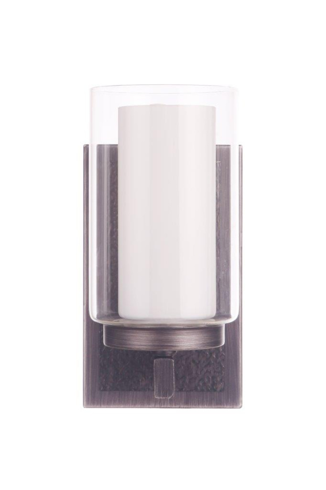 The Texture Vanity Collection offers an updated rugged appeal of the wide hammered metal back plate complements the double glass shades featuring a crisp clear glass outer shade with white frosted inner shade. Texture is offered in five sizes from a single light sconce to a five light vanity.