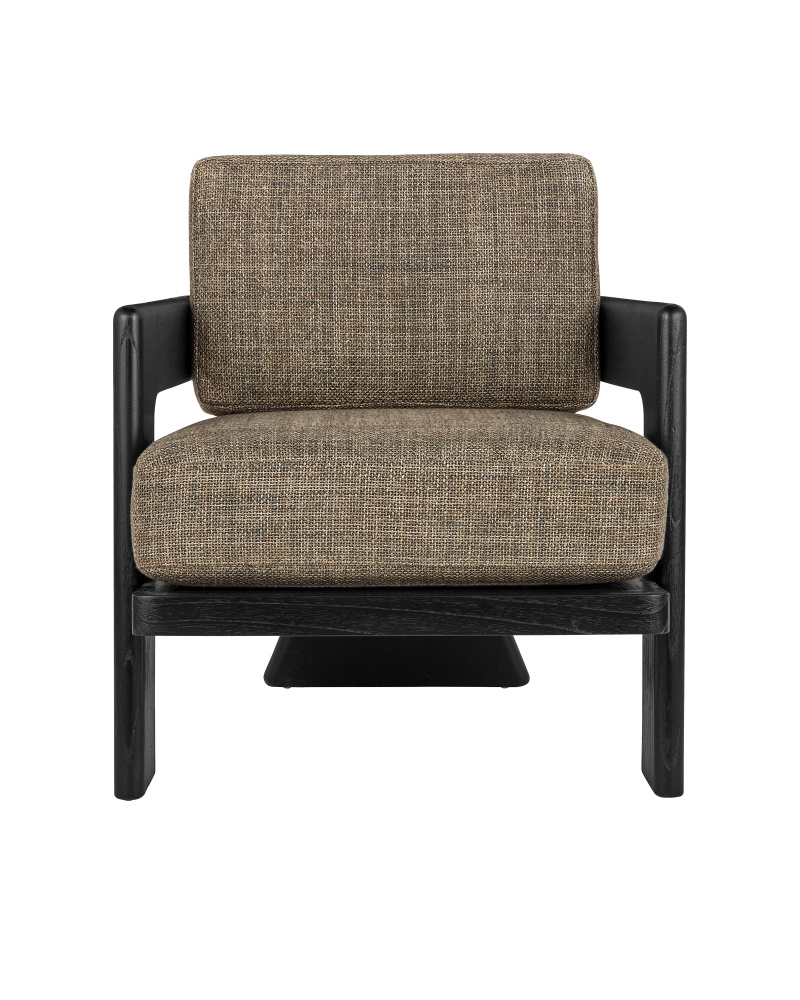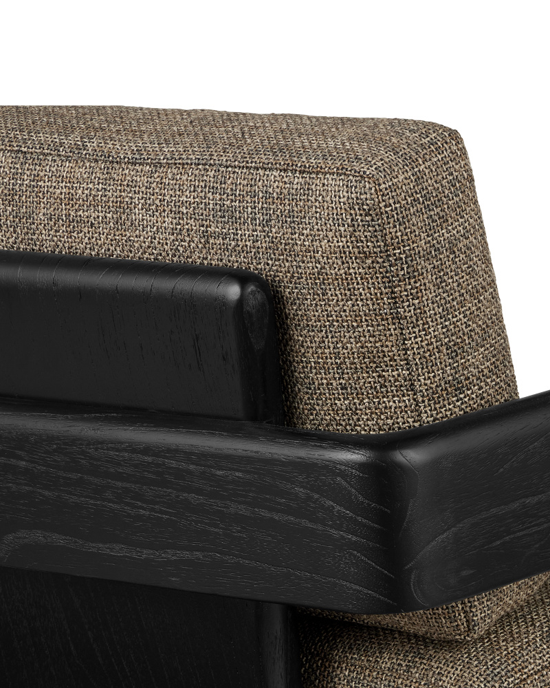 The Theo Lounge Chair, covered in Rig Otter fabric, has a solid Mindi wood frame in a caviar black finish. The upholstery fabric on this piece packs a punch with its textural weave and serves as a light contrast to the dark wood. The back leg on the roomy chair splays backwards to create an interesting profile. The deep tones in the wood draw out the darker tones in the nubby fabric.