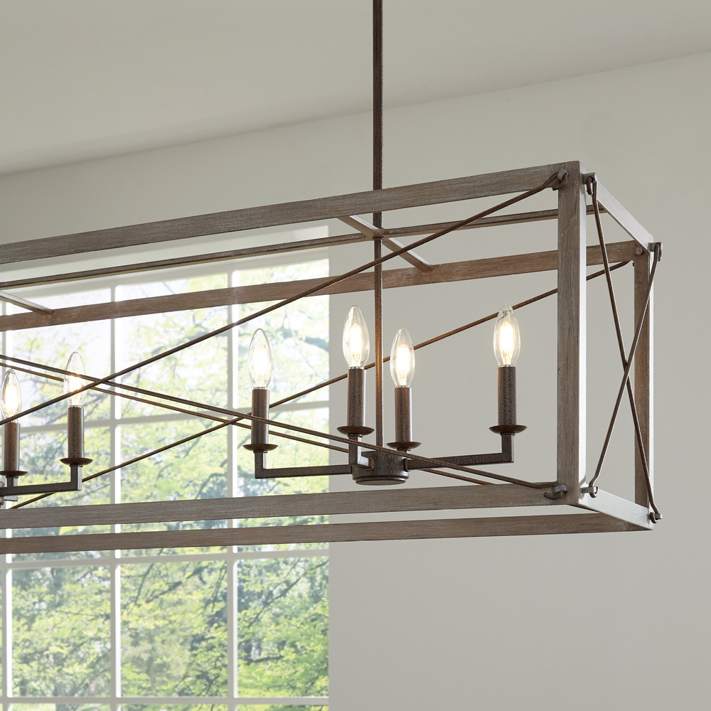 The Thornwood eight light linear chandelier in washed pine supplies ample lighting for your daily needs, while adding a layer of today's style to your home's décor. The hand applied finishes on Thornwood exude authenticity, combining the tactile with the time-worn. Perfect proportions and honest functionality complete the package. The Thornwood lighting collection offers three-light, four-light and eight-like chandeliers, an eight-light linear, four-light foyer chandelier, and a two-light wall sconce. The two-light wall sconce is Damp Rated. Available in Washed Pine and a Weathered Iron Finish.