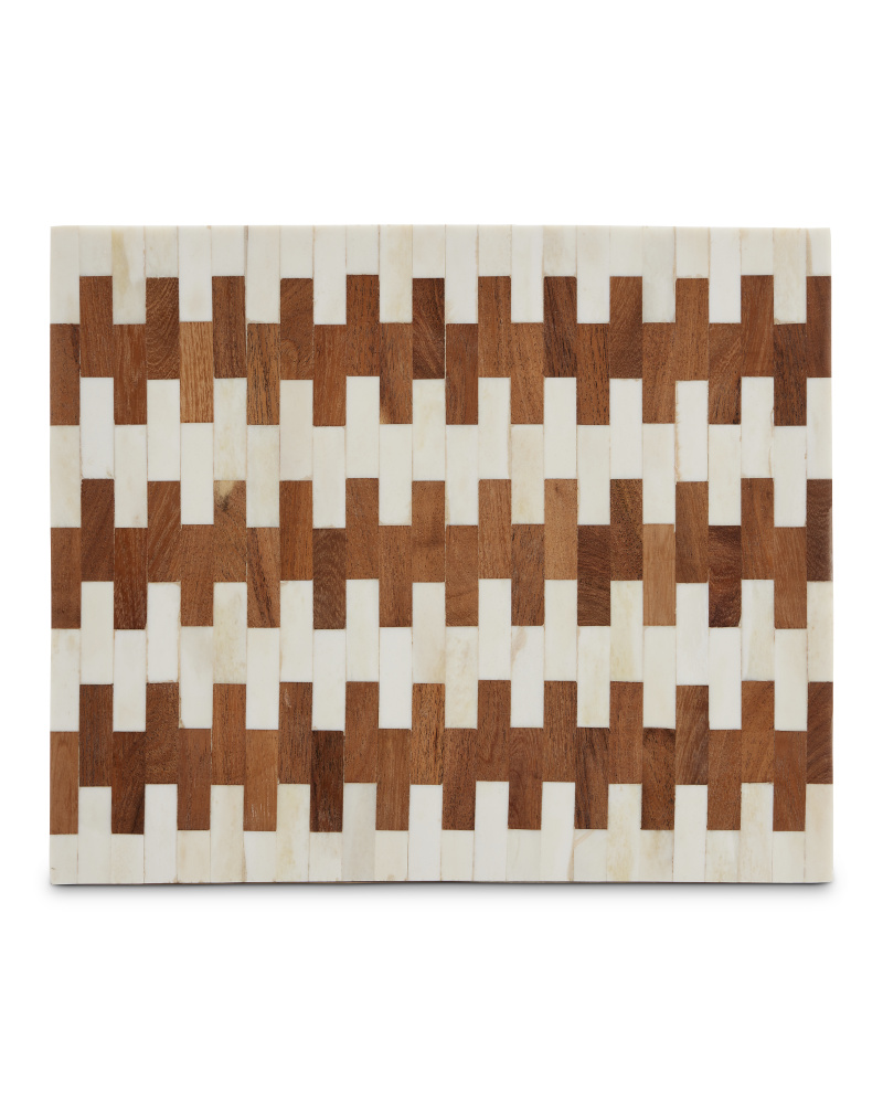 The Tia Box Set includes two decorative accessories in smaller and larger sizes. The offset brick pattern that runs along the sides and tops is made of white bone and wood, bringing the brown decorative boxes a refined sense of movement that resembles piano keys. Both boxes are linen-lined, with brass pins on the inside to ensure the pattern stays aligned.