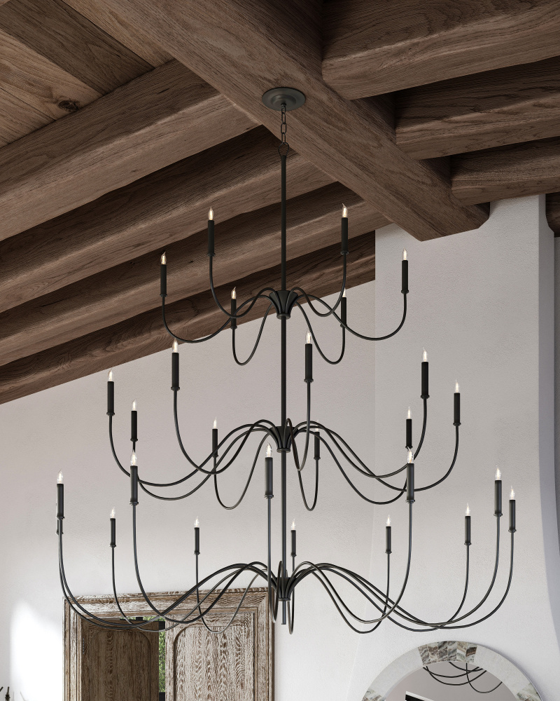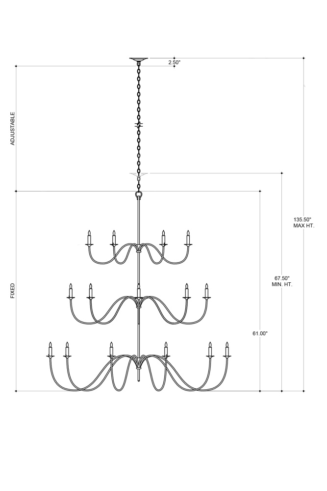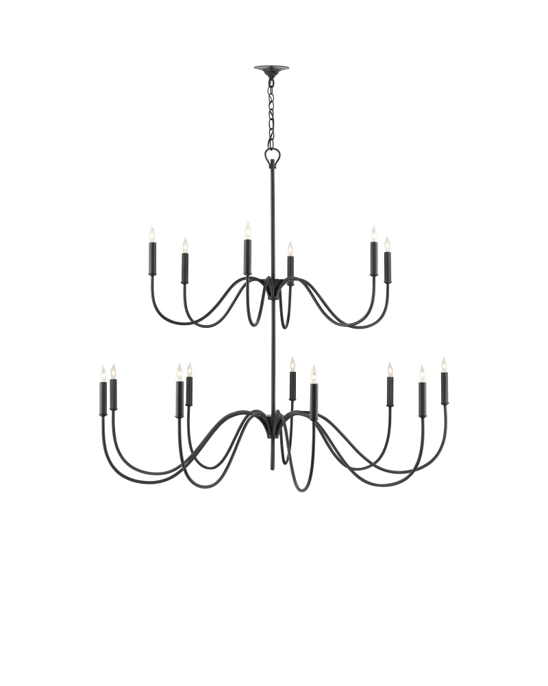 A nod to Early American style, the Tirrell Large Chandelier has graceful arms that arc upward to hold its candle sleeves with simple dignity. The black chandelier is made of wrought iron in an antique black finish. Adjustable from 67.5" to 135.5" with use of included chain/rod kit/cable. If your space calls for a longer drop, additional chain/rods/cable is available for purchase.