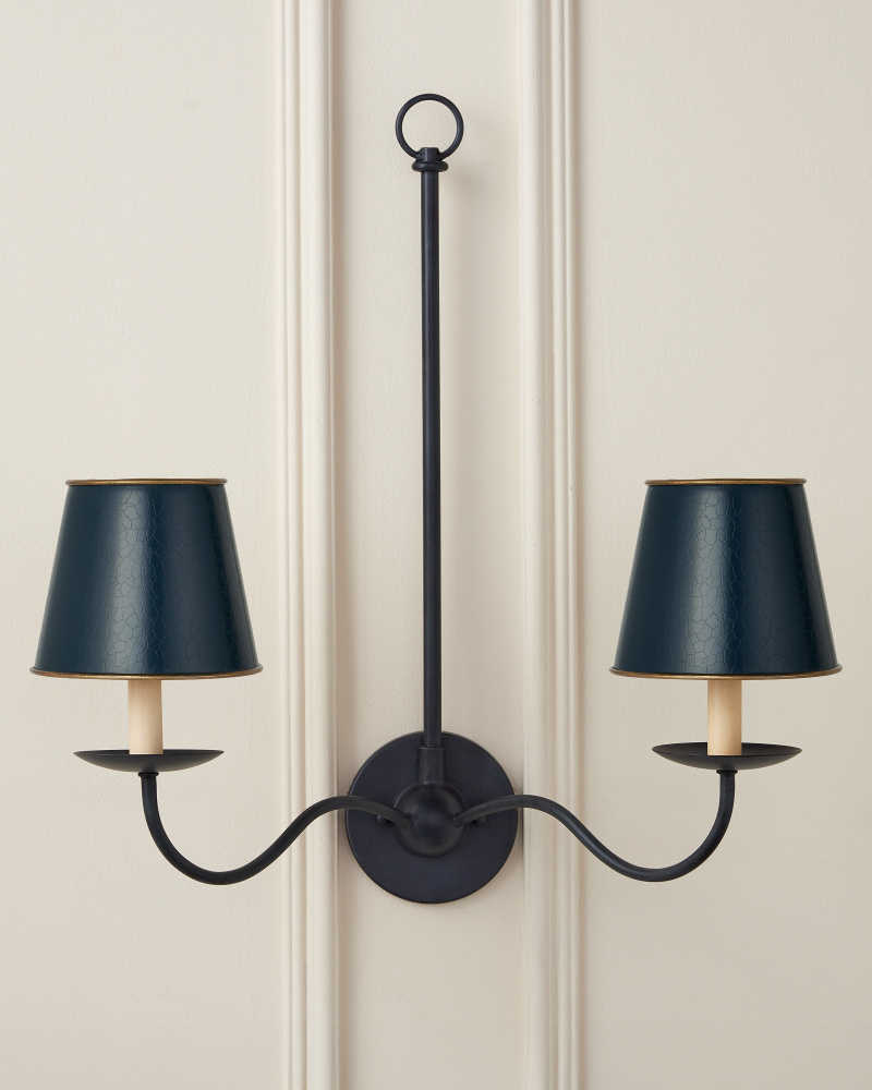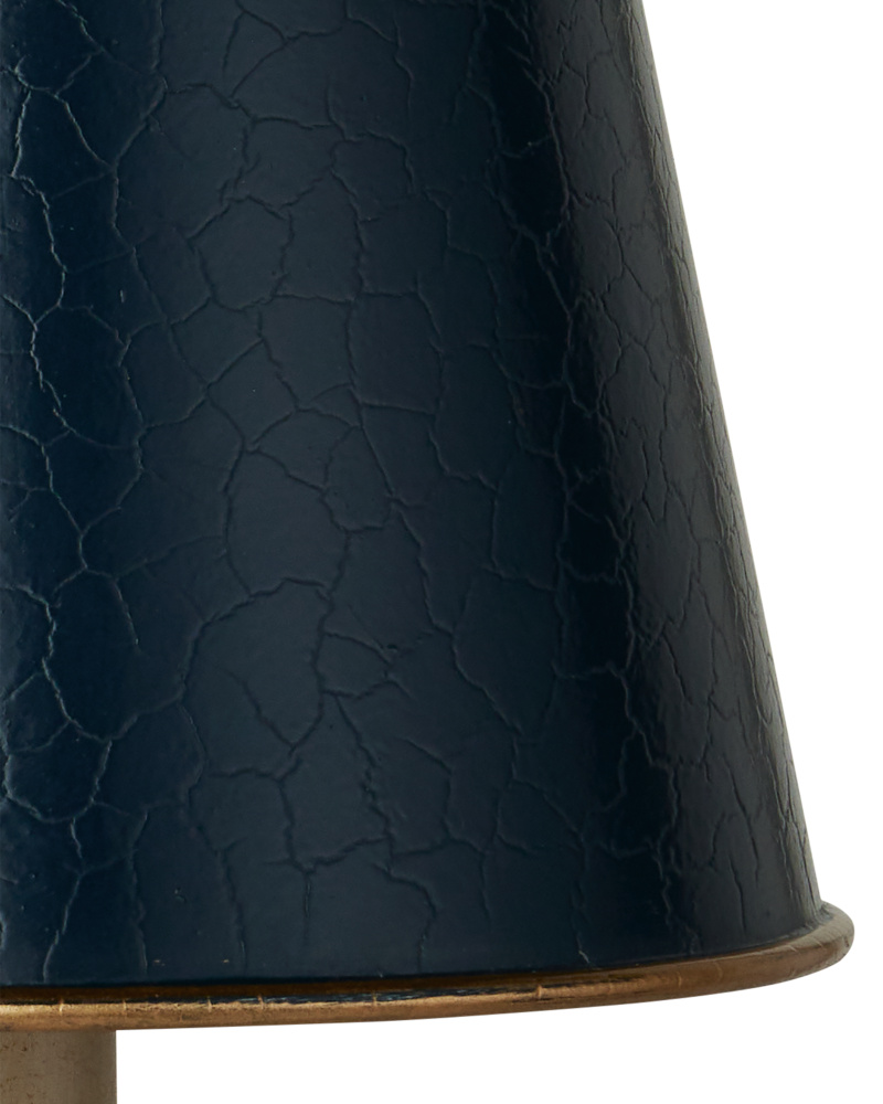 Petite shades are an easy way to bring added style and refinement to a space. The Tole Blue Tapered Chandelier Shade is made of metal in a navy finish with raised rims of gold detailing at the top and bottom of the shade, which is fitted with a candle clip. The finish has a subtle crackle effect that will add a classic patina to any fixture.