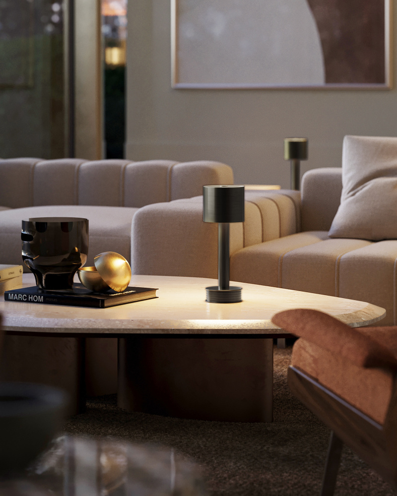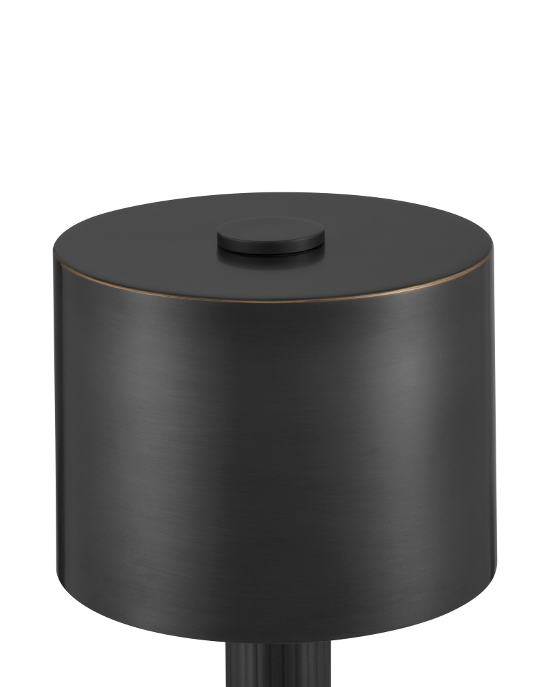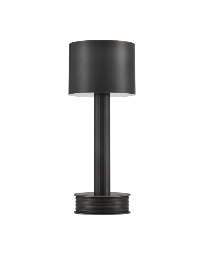 The Traverse Bronze Cordless Table Lamp is a black lamp that has a way of getting around. The metal lamp in an oil-rubbed bronze finish is petite in size, and its base holds the on/off switch. The matching metal shade has the same deep warmth as the rest of it. to recharge, simply place the lamp on its separate charging pad.