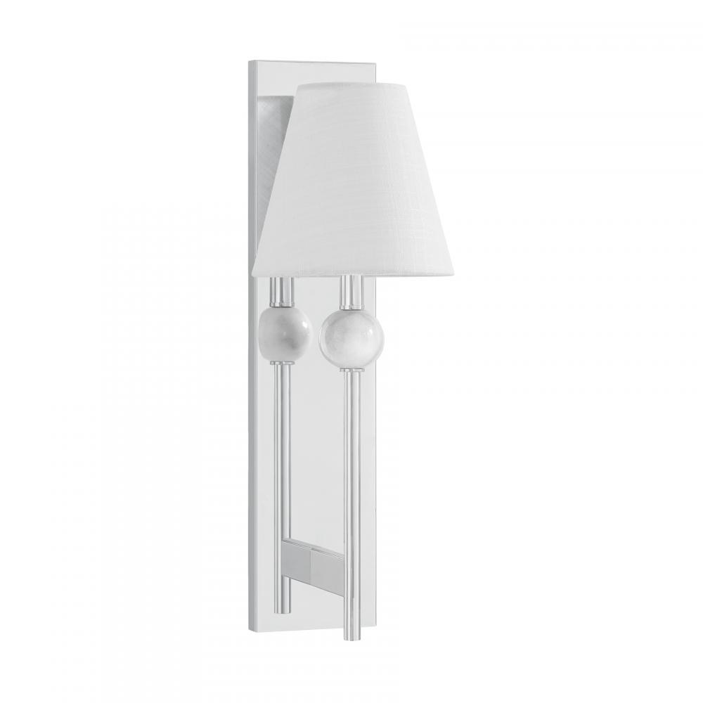The effortlessly elegant Savoy House Travis 1-light sconce showcases a special touch – an orb of beautiful natural white marble with dark veining. Each piece of marble is unique and will have different veining patterns. This marble takes center stage in an otherwise subtle and understated design. A white fabric shade provides comfortable light while a Polished Chrome finish adds shine. Travis is 22" in height, 7.5" in width and extends 8.5" from the wall. Uses one candelabra size bulb of up to 60 watts. The bulb is not included.