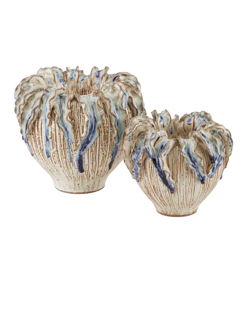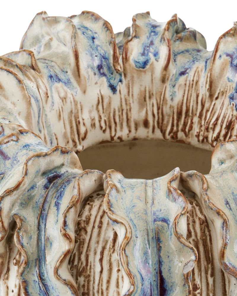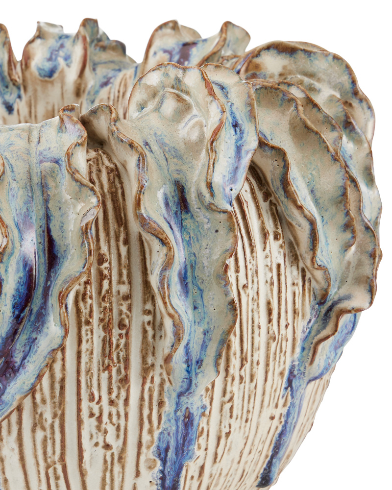 The Tropical Crown Medium Vase is made of ceramic glazed in a mix of ivory and reactive blue. The leaves of the ivory vase that form the ruffles are done by hand using the painstaking pinch method by a group of women artisans. Then the reactive blue glazing is dripped on them in an artisanal flourish.