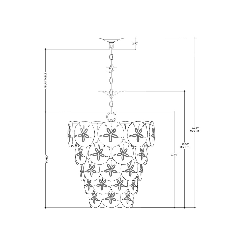 Marjorie Skouras designed the Tulum White Chandelier, inspired by the tropical beauty of the Yucatan Peninsula where she lives. This is a beautifully delicate design, as the sand dollars are cast in semi-translucent bone China and they make a pretty sound when a breeze ruffles them. There are three sizes of removable sand dollars on this design, which makes it easy to clean them. The sugar white finish on the hardware complements the pale discs on this nature-inspired chandelier, making it apropos for rooms overlooking the ocean. Adjustable from 28.5" to 96.5" with use of included chain/rod kit/cable. If your space calls for a longer drop, additional chain/rods/cable is available for purchase.