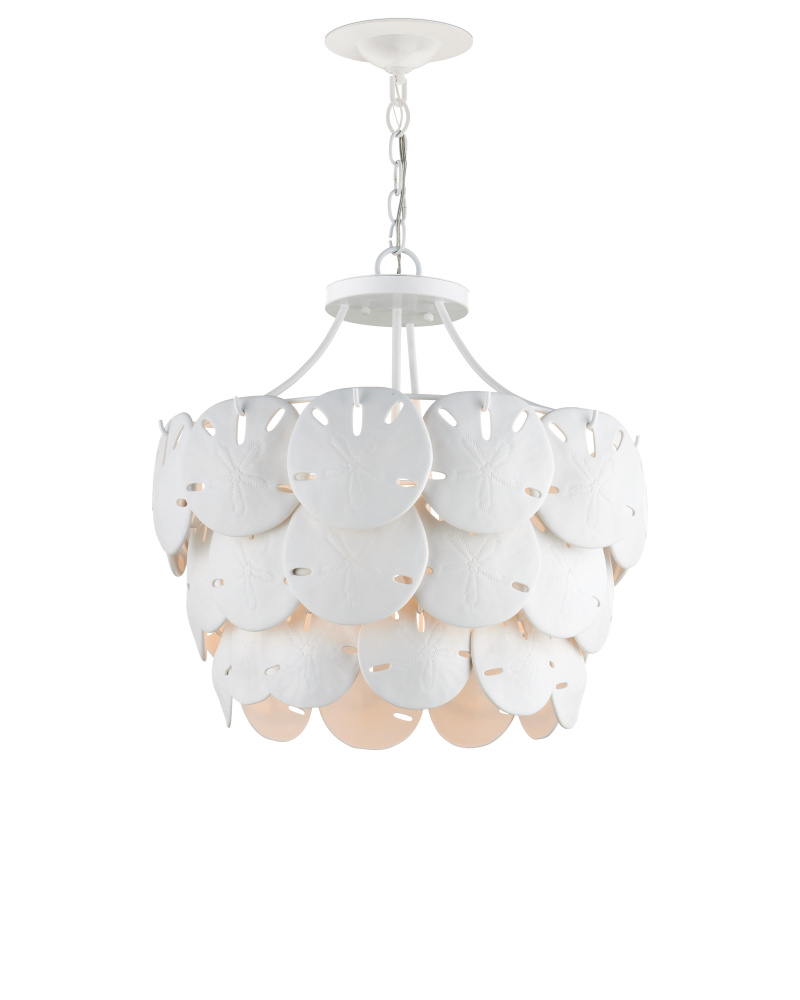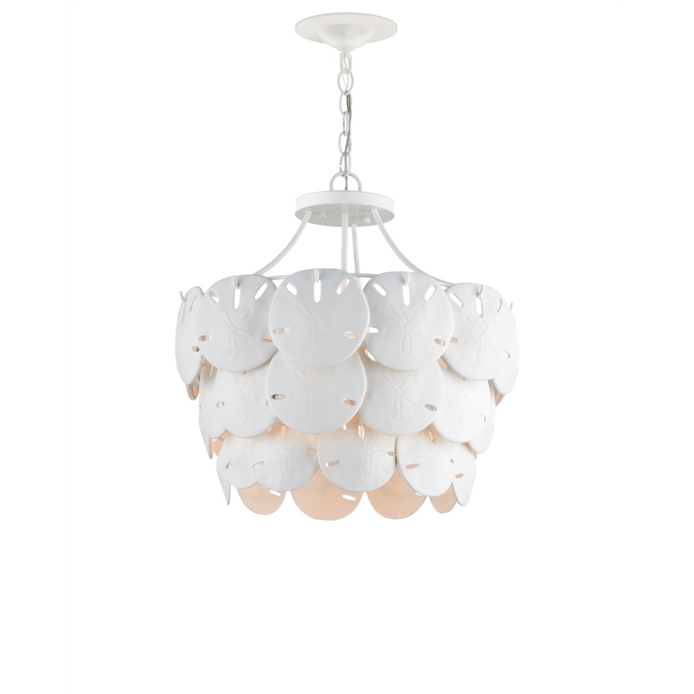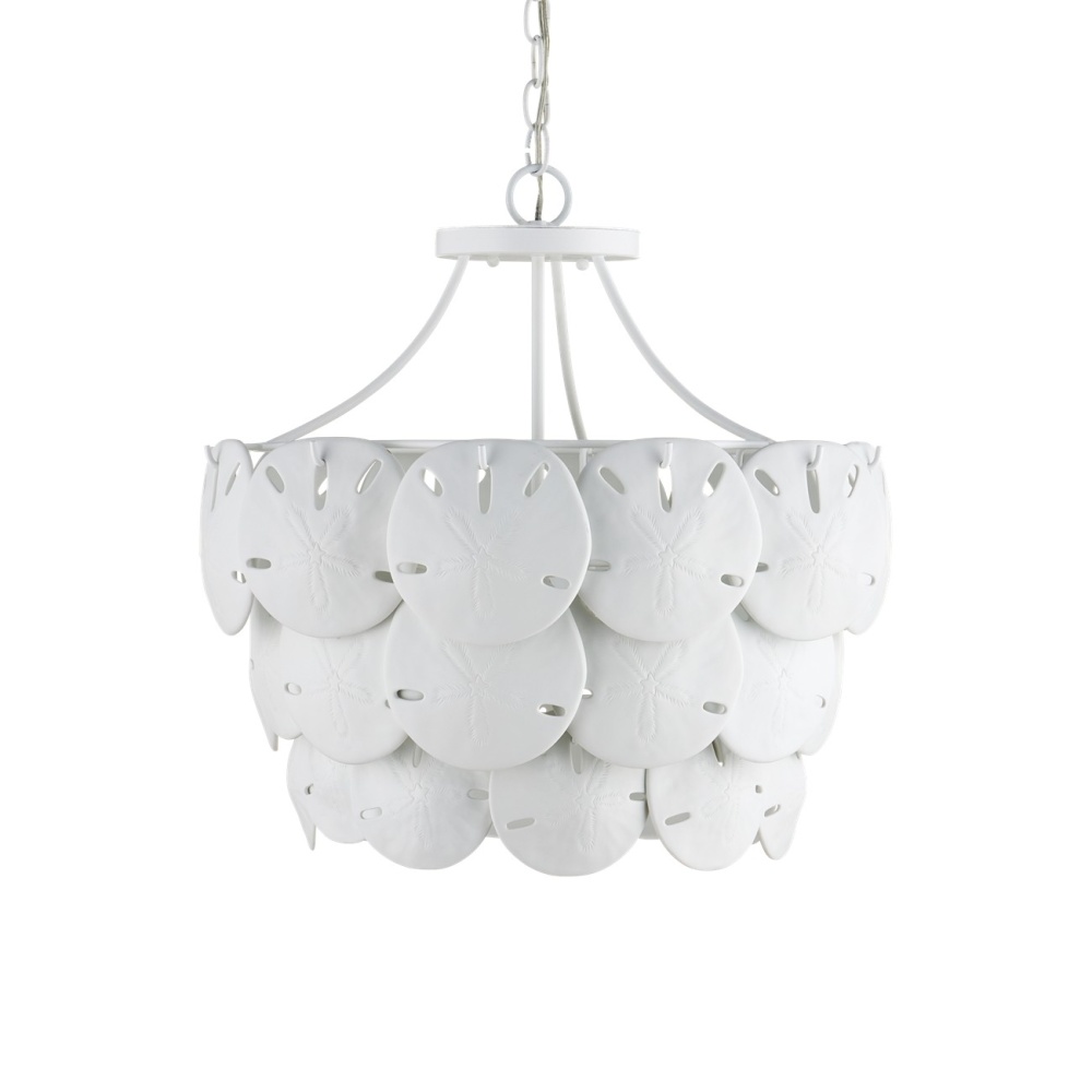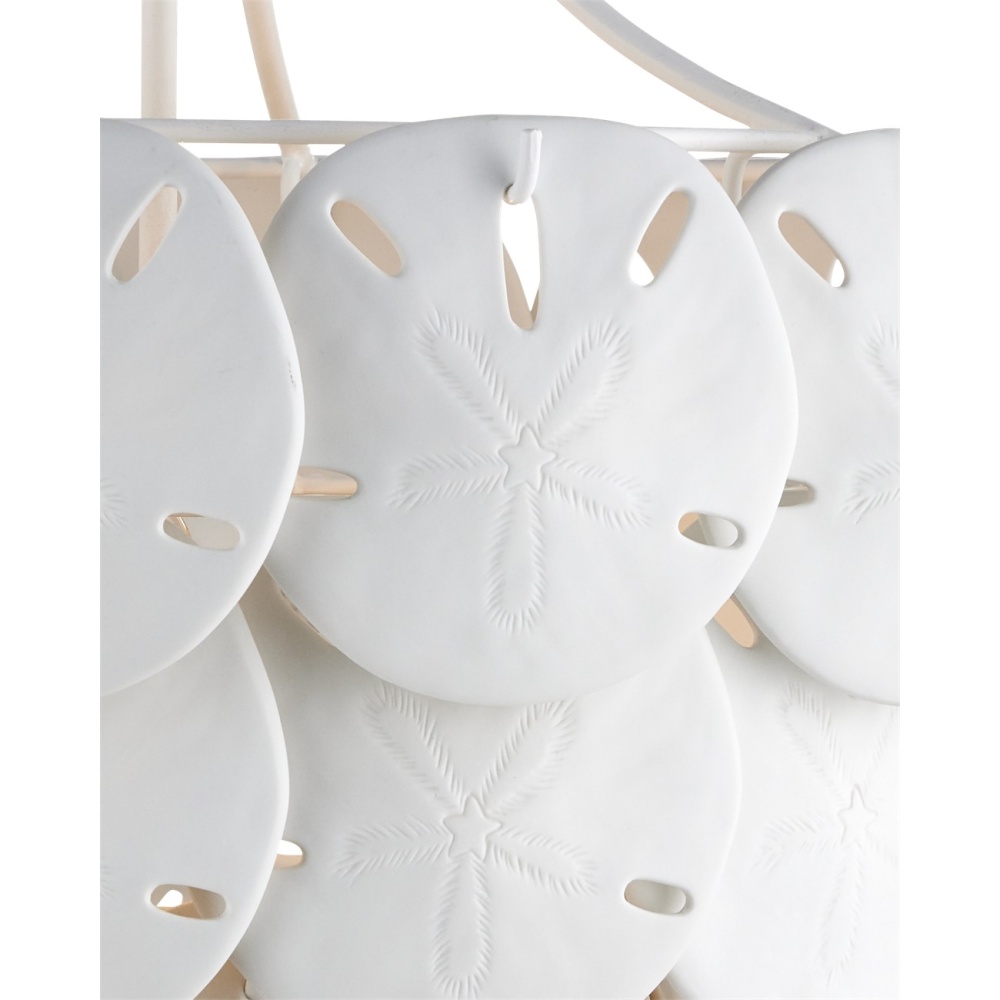 Marjorie Skouras designed the Tulum Medium Chandelier, inspired by the tropical beauty of the Yucatan Peninsula where she lives. This is an elegantly delicate design, as the sand dollars are cast in semi-translucent bone China and they make a pretty sound when a strong breeze ruffles them. There are three sizes of removable sand dollars on this design, which makes it easy to clean. The sugar white finish on the hardware complements the pale discs on this nature-inspired chandelier, making it apropos for rooms overlooking the ocean. Adjustable from 18.75" to 95.25" with use of included chain/rod kit/cable. If your space calls for a longer drop, additional chain/rods/cable is available for purchase.