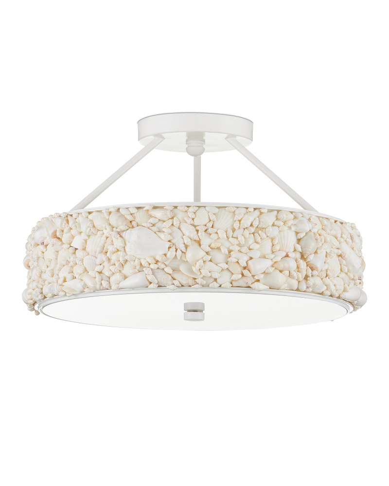 The Turbinella Semi-Flush Mount is artfully covered with a mosaic of pastel sea shells on its outer surface, the variations in sizes and paleness bringing the one-light fixture a textural quality. The frame, made of wrought iron in a sugar white finish, draws out the lightest tones in the shells. The white semi-flush is fitted with an acrylic diffuser that softens the glow of the integrated LED inside.