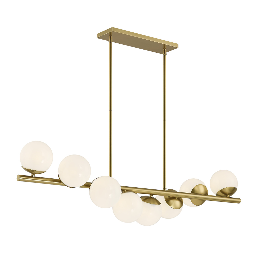 The Savoy House Turin 8-light linear pendant makes a bold mid-century modern statement, brought to life by award-winning designer Dann Foley. A rhythmic row of opal glass spheres creates a sense of movement, beautifully paired with a Warm Brass finish that heightens its sculptural appeal. Perfect over a dining table or kitchen island, Turin brings style and atmosphere in generous measure. It is 12" in height, 45" in width and 12" in length. It uses eight G9 bulbs of up to 60 watts per bulb. Bulbs not included. Comes with eight 12" downrods and two 6" downrods.